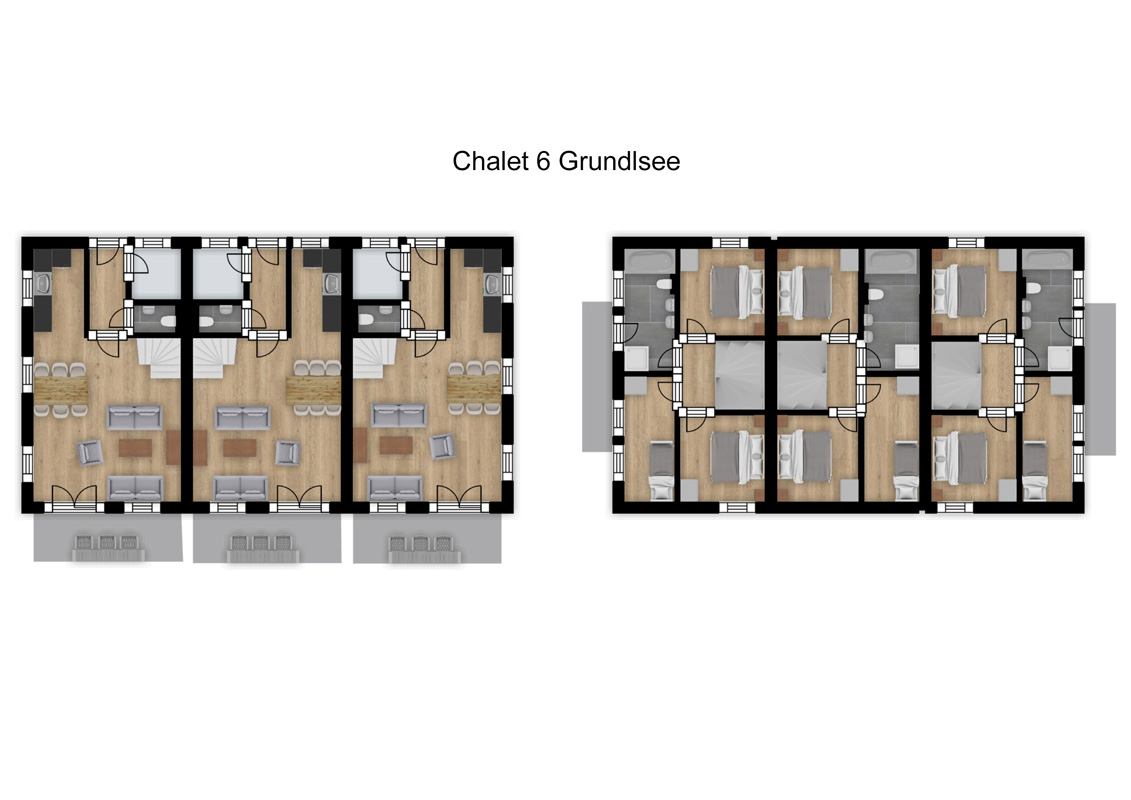 110 m² - 1. podlaží chaletu: obývací pokoj s kuchyňským a jídelním koutem, gauč, samostatné WC, privátní sauna se sprchou, terasa; 2. podlaží chaletu: 3 ložnice s manželskou postelí či 2 samostatnými lůžky, 2x sociální zařízení se sprchou, balkon (společný pro 2 ložnice)