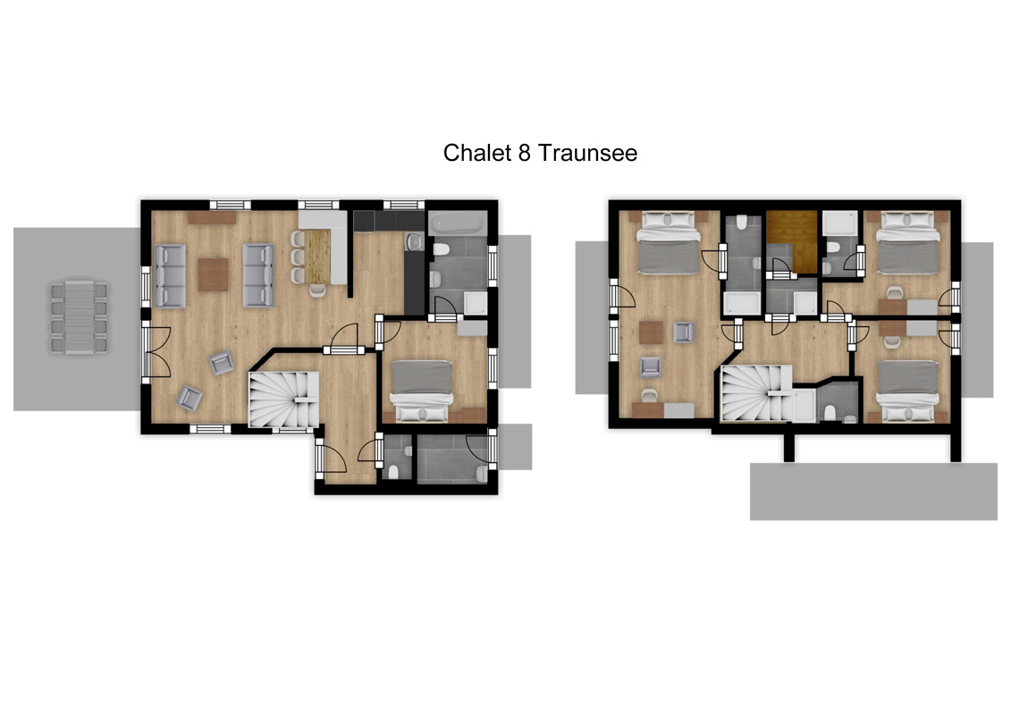 140 m² - 1. podlaží chaletu: ložnice s manželskou postelí či 2 samostatnými lůžky a sociálním zařízením se sprchou, obývací pokoj s kuchyňským a jídelním koutem, gauč, samostatné WC, terasa; 2. podlaží chaletu: 3 ložnice s manželskou postelí či 2 samostatnými lůžky a sociálním zařízením se sprchou, privátní sauna se sprchou, 2 balkony (z nich 1 společný pro 2 ložnice)