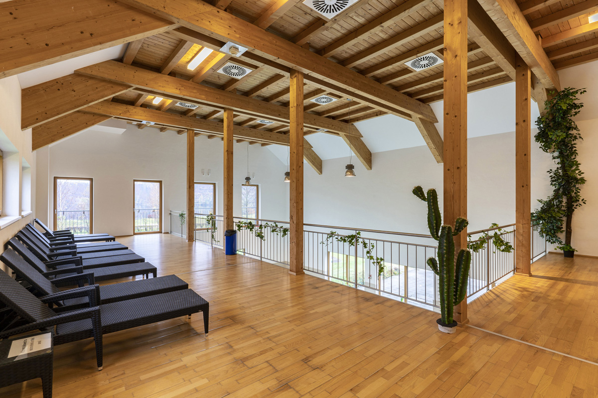 bazén 12 x 5 m; sauna*, pára*, infrakabina*, relaxační koutek s lehátky, půjčovna jízdních kol*, kajaků* a paddleboardů*, posilovna, stolní tenis