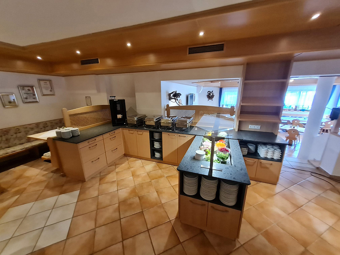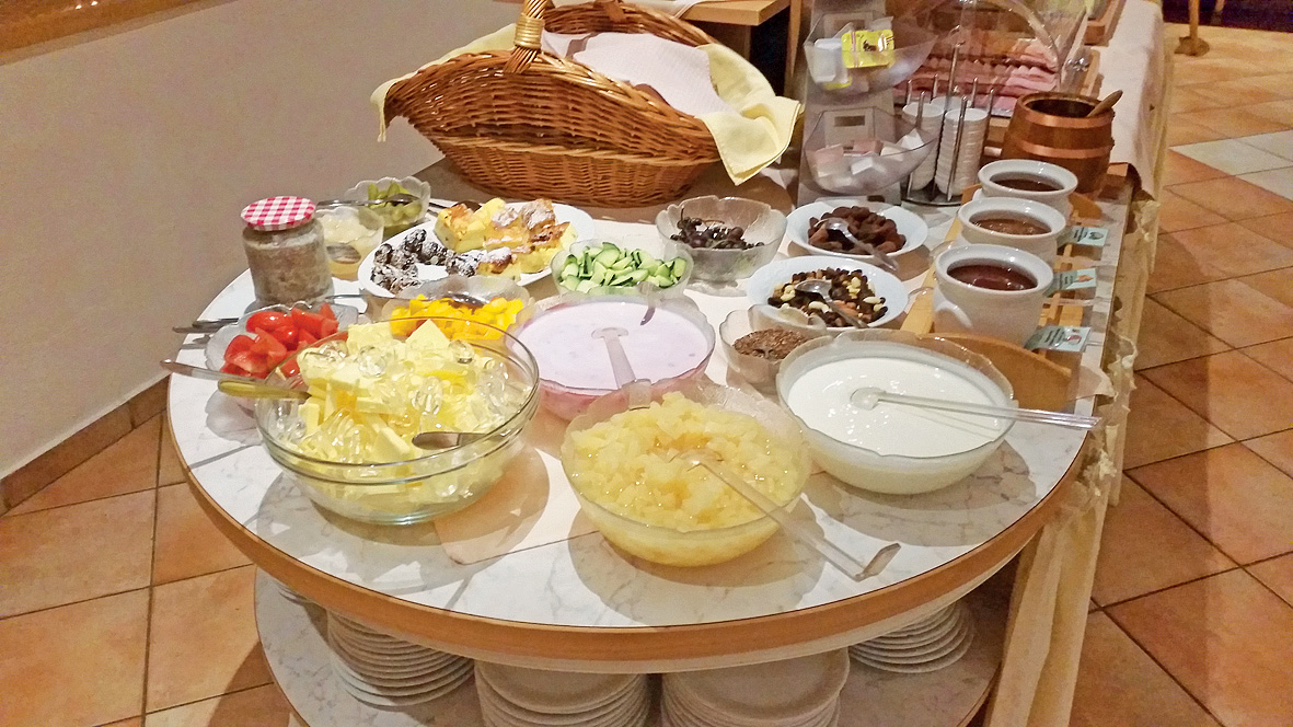 servírované 3chodové menu či formou bufetu s výběrem hlavního jídla s přílohou, zpravidla servírovaný předkrm, salát a dezert; 1x týdně tematický bufet či grilování (v závislosti na počasí); od 15:00 do 21:00 hodin zdarma vybrané nealkoholické nápoje, káva, kakao a čaj; ostatní nápoje za poplatek