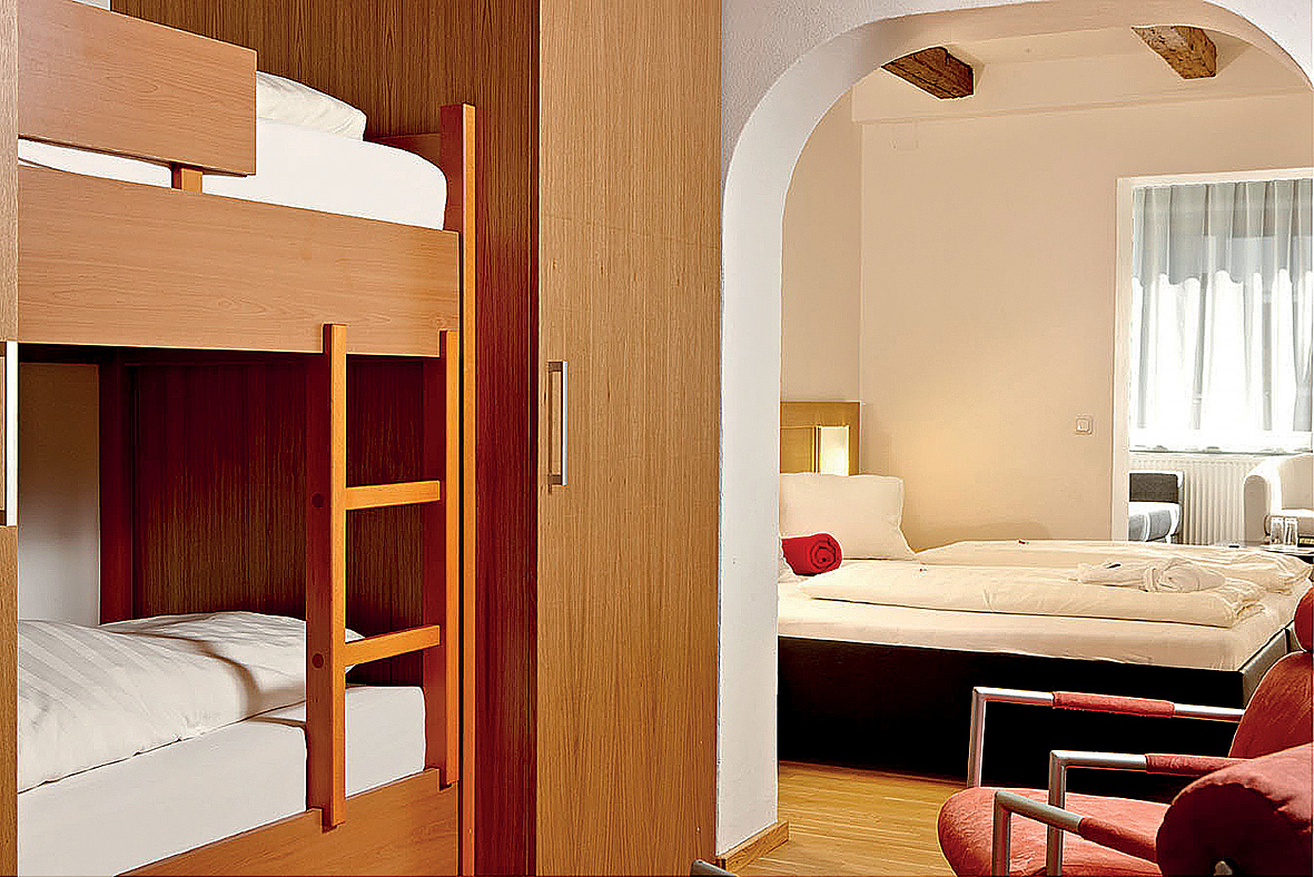 40 m² - pokoj se dvěma opticky oddělenými částmi s manželskou postelí a 2 samostatnými lůžky a případně rozkládacím gaučem pro 1 osobu, sociální zařízení s vanou, balkon; minimální obsazenost pokoje 4 osoby; infant nad maximální obsazenost pokoje není povolen!