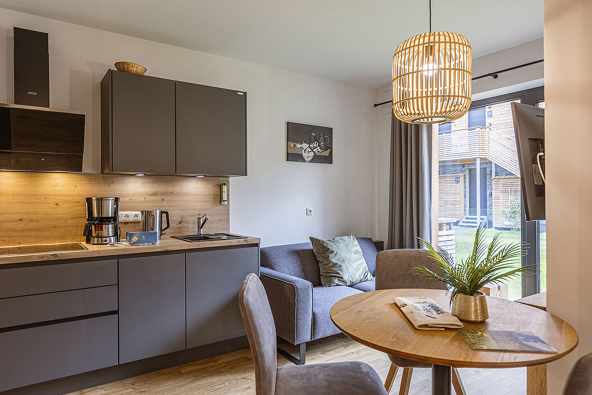 65 m² - ložnice s manželskou postelí, obývací pokoj s kuchyňským koutem a rozkládacím gaučem, sociální zařízení, balkon