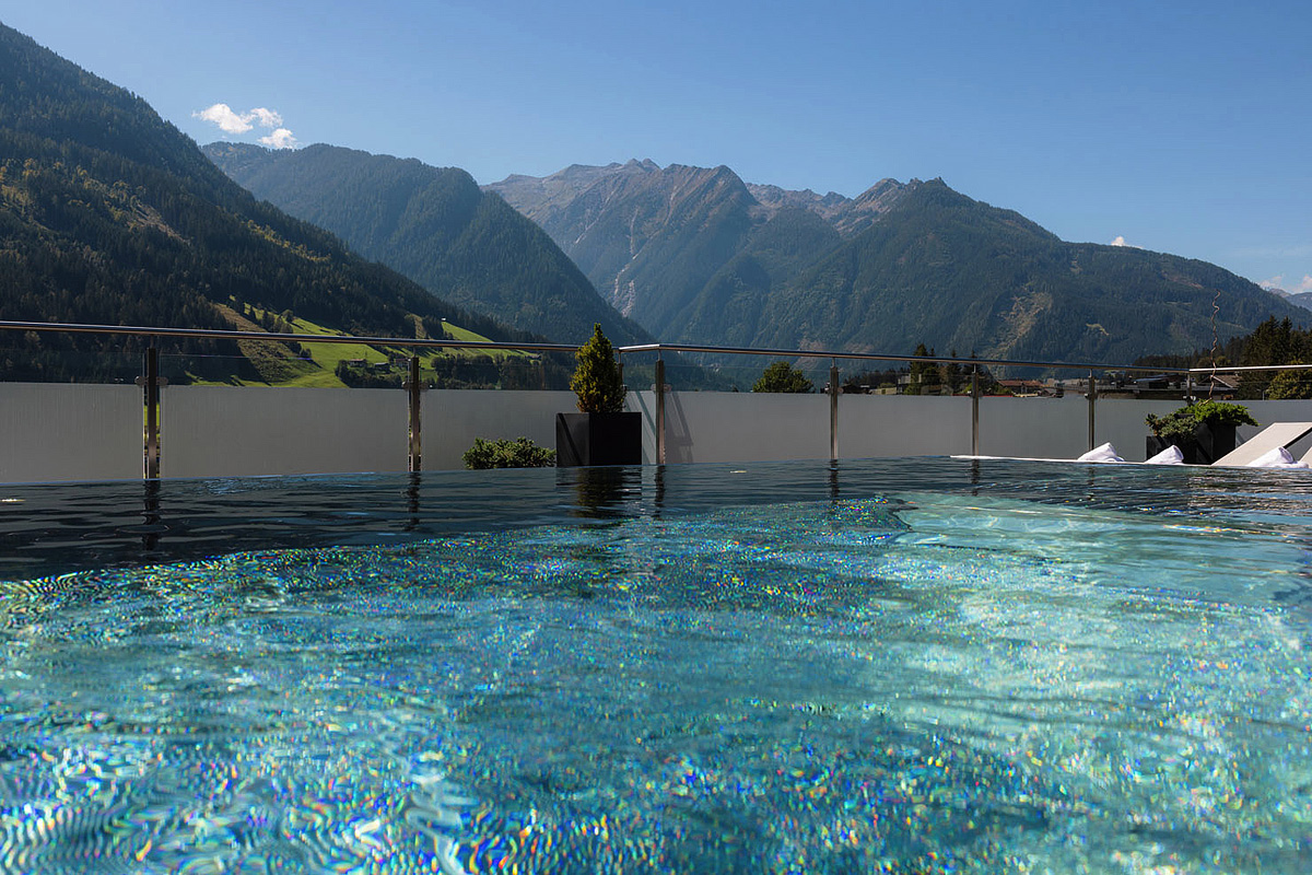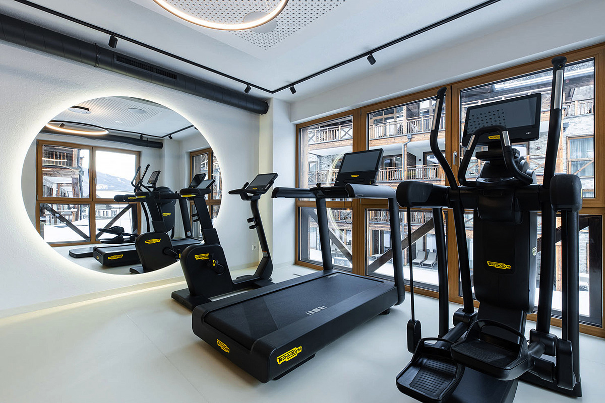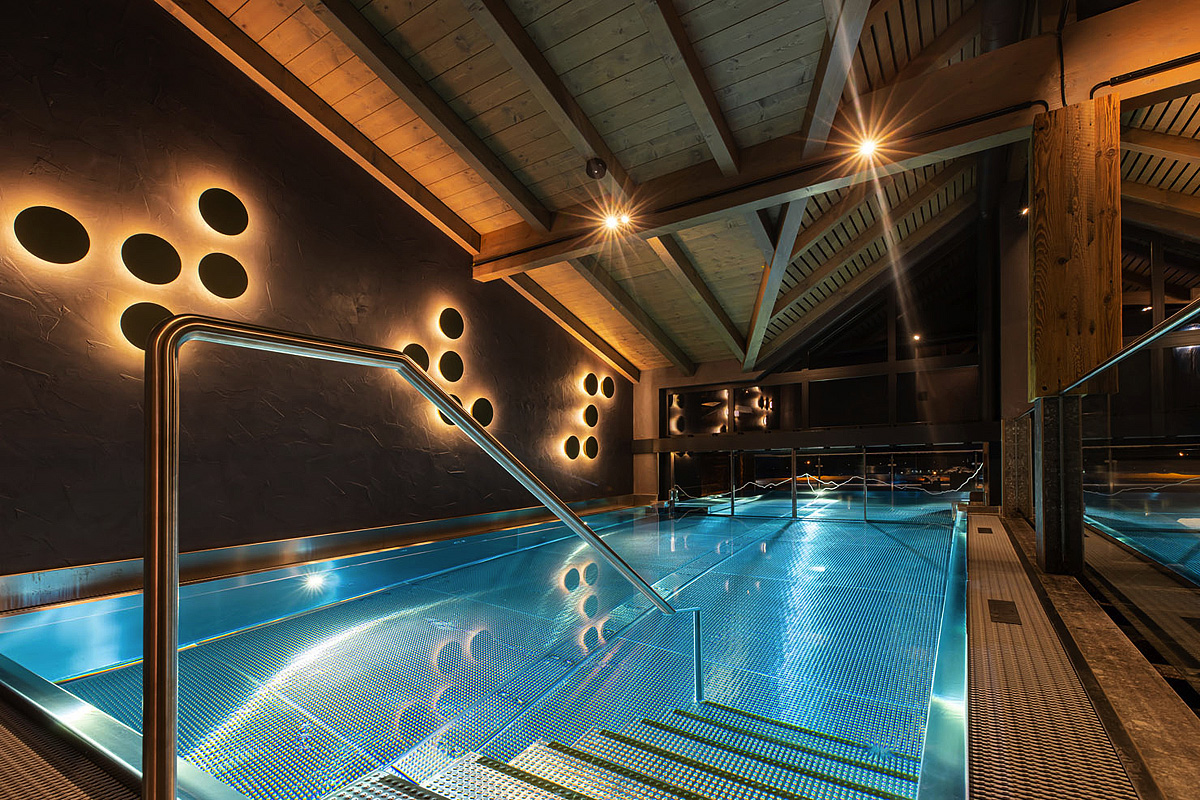 bazén propojený s venkovním bazénem umístěným na střeše resortu, 2x finská sauna, biosauna, pára, infrakabina, posilovna