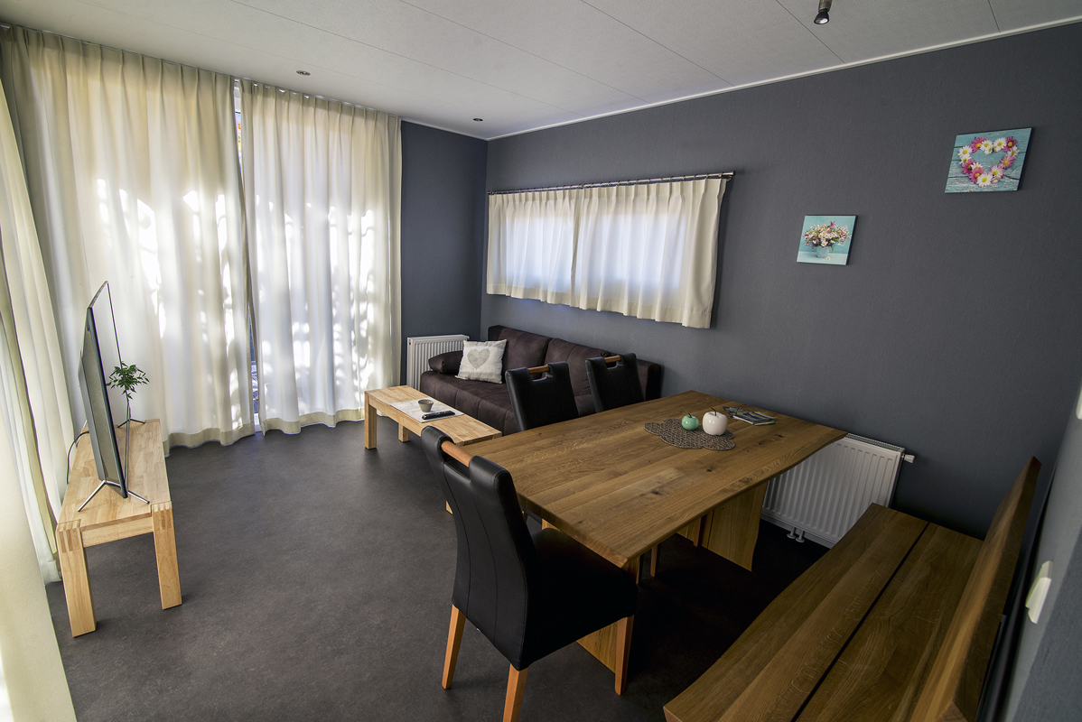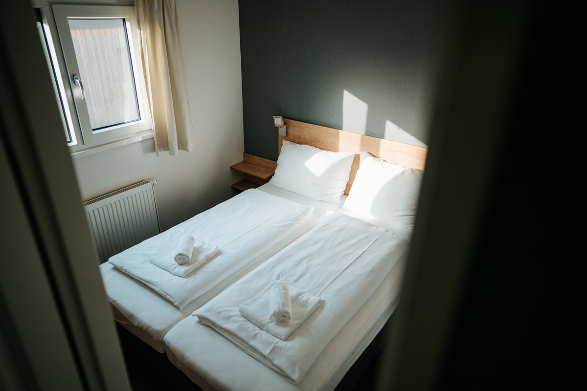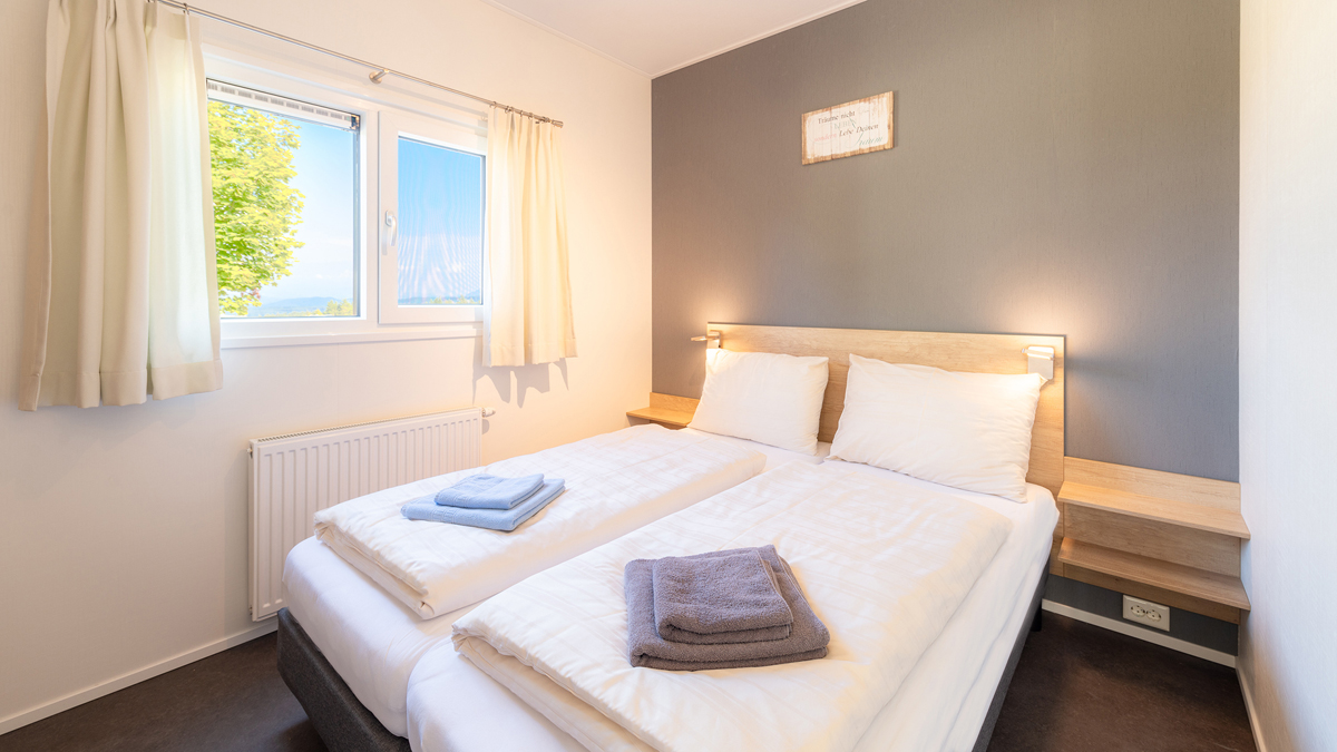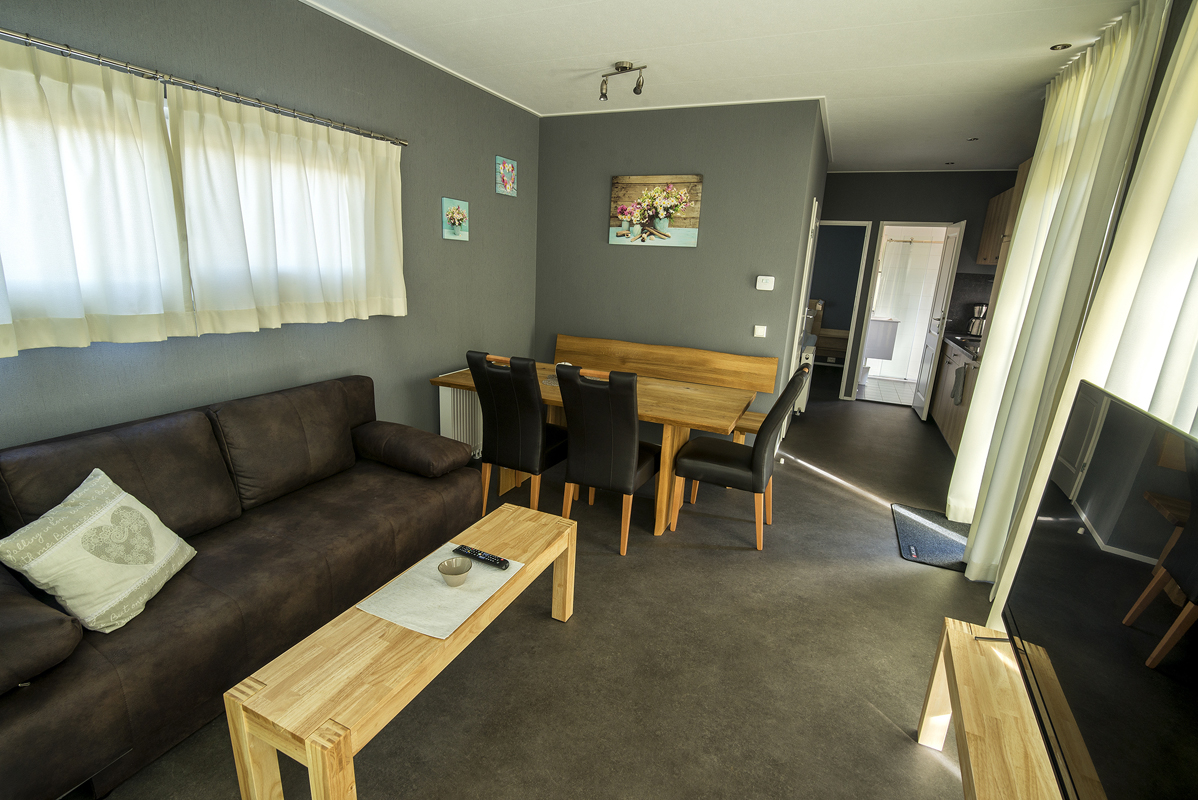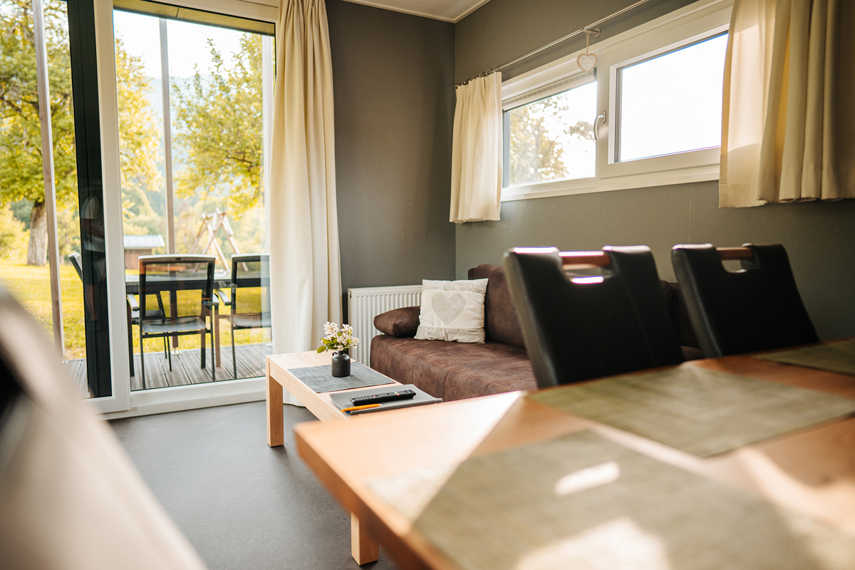 Chalet 4+2 - 45 m² - 1 ložnice s manželskou postelí, ložnice se 2 samostatnými lůžky, obývací pokoj s kuchyňským koutem a gaučem pro 2 děti do nedovršených 17 let, sociální zařízení, terasa