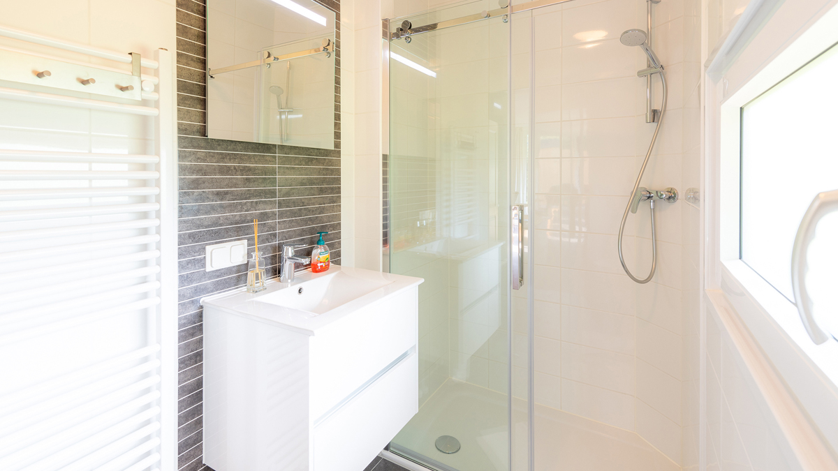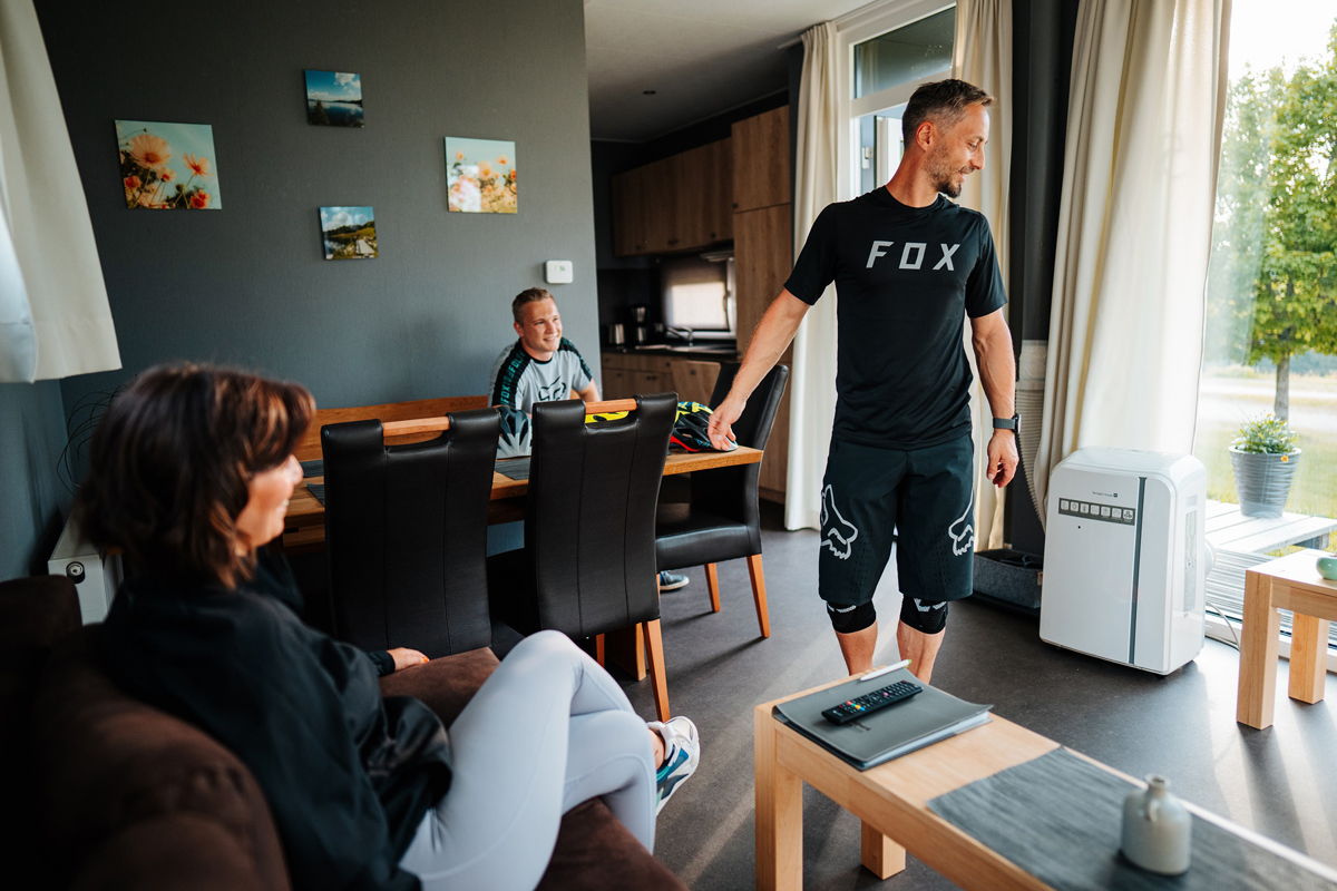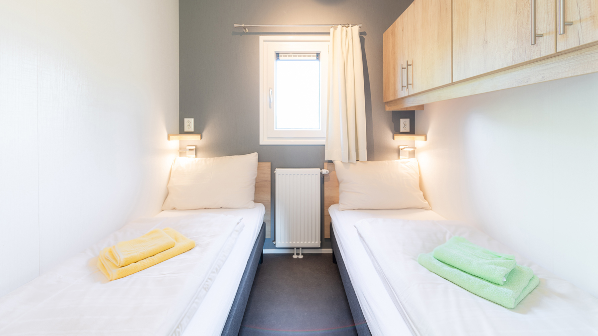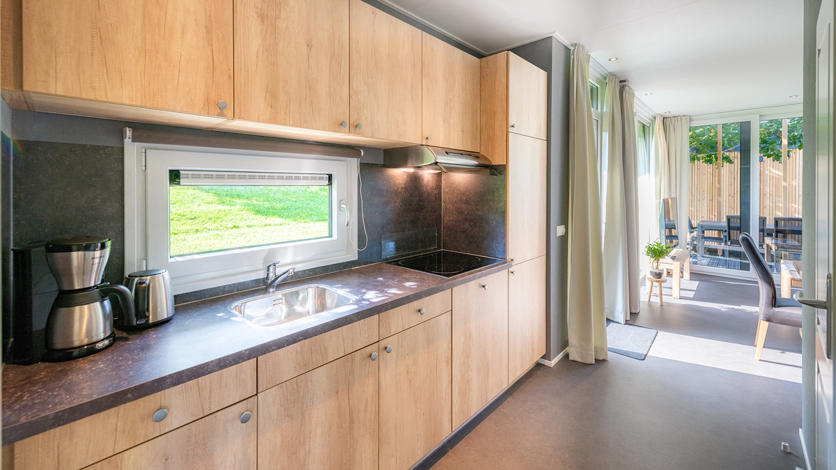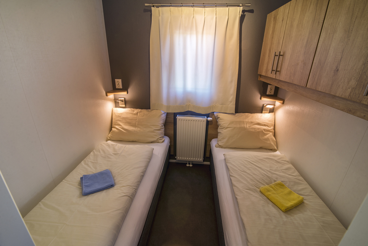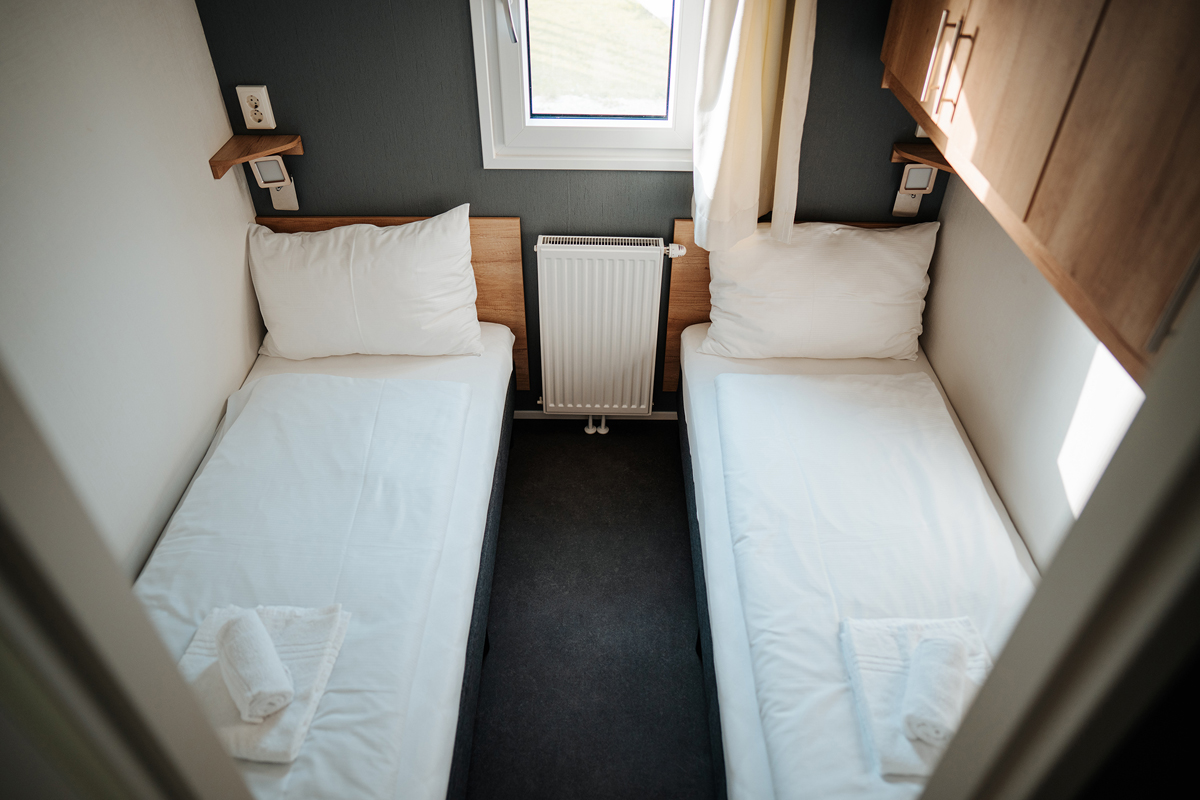 Chalet 4+2 - 45 m² - 1 ložnice s manželskou postelí, ložnice se 2 samostatnými lůžky, obývací pokoj s kuchyňským koutem a gaučem pro 2 děti do nedovršených 17 let, sociální zařízení, terasa