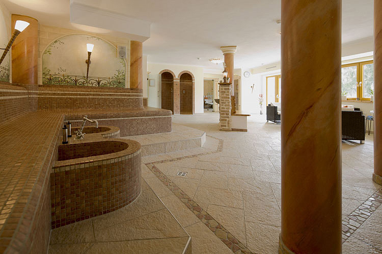 jezírko ke koupání* (350 m²), sauna#, pára#, infrakabina#, zážitková sprcha#, Kleippův chodník#, ledová jeskyně#, relaxační koutek s lehátky a vodními postelemi#, posilovna, stolní fotbal, stolní tenis; služby označené # mohou využívat pouze děti starší 14 let