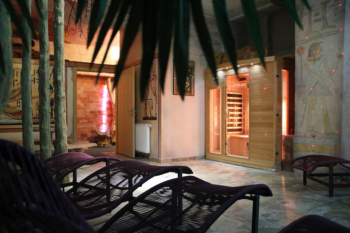vířivka*, finská sauna#, pára#, infrakabina#, relaxační koutek s lehátky#, solárium*, posilovna*#; služby označené # mohou využívat děti až od 18 let