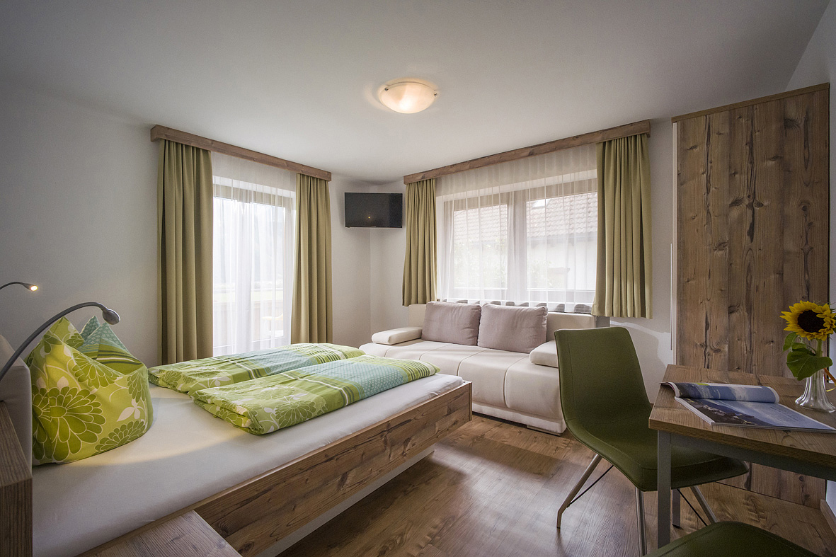 pokoj s manželskou postelí a případně rozkládacím křeslem či gaučem či přistýlkou pro 1 osobu, sociální zařízení se sprchou, většinou balkon