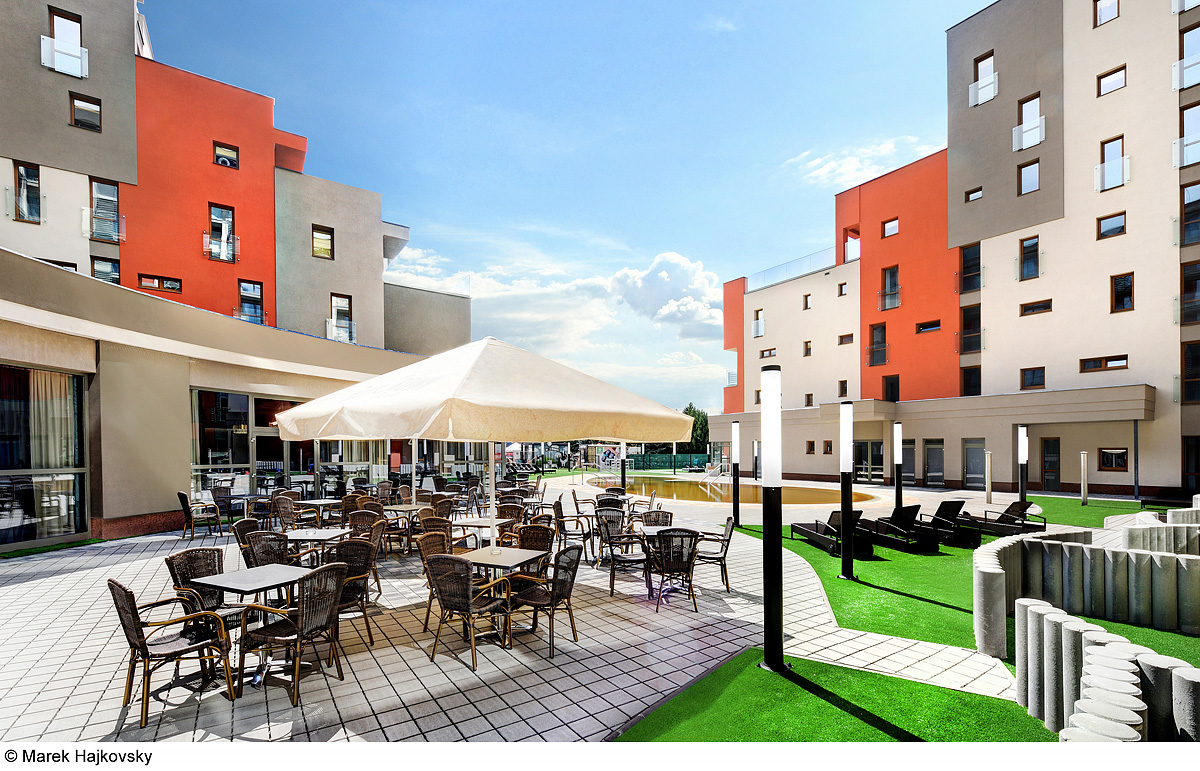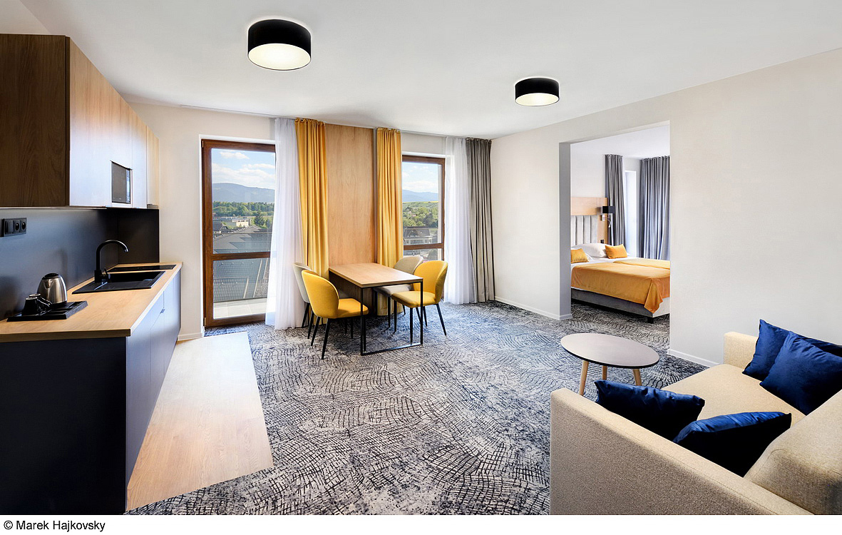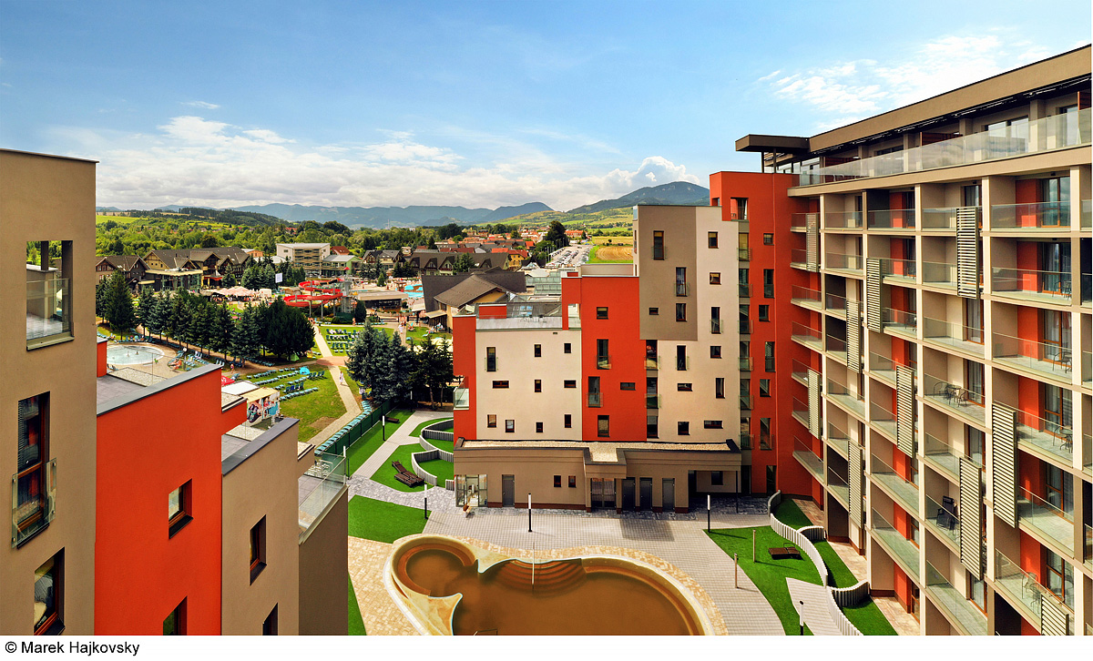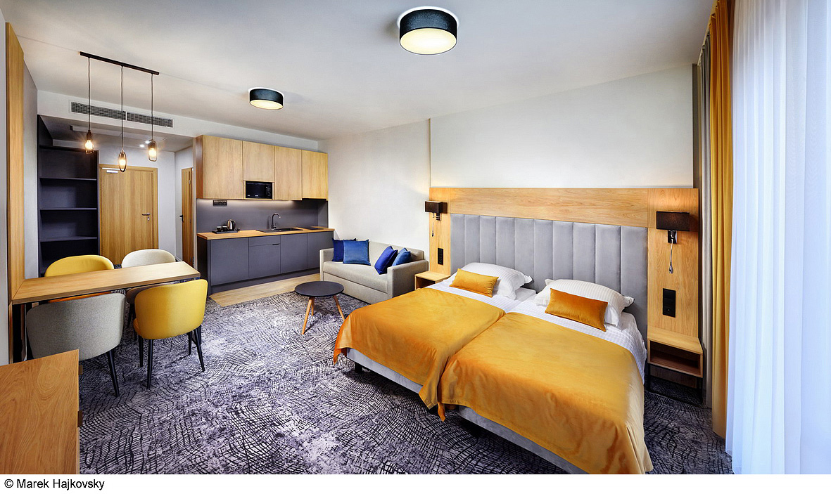 ložnice s manželskou postelí s oddělitelnými lůžky, obývací pokoj s kuchyňským koutem a jídelním stolem s rozkládacím gaučem pro 2 osoby, 2 x sociální zařízení se sprchou, privátní terasa; 9. podlaží s panoramatickým výhledem na vodní park a okolní krajinu