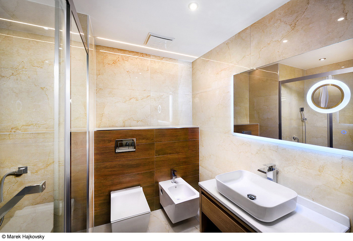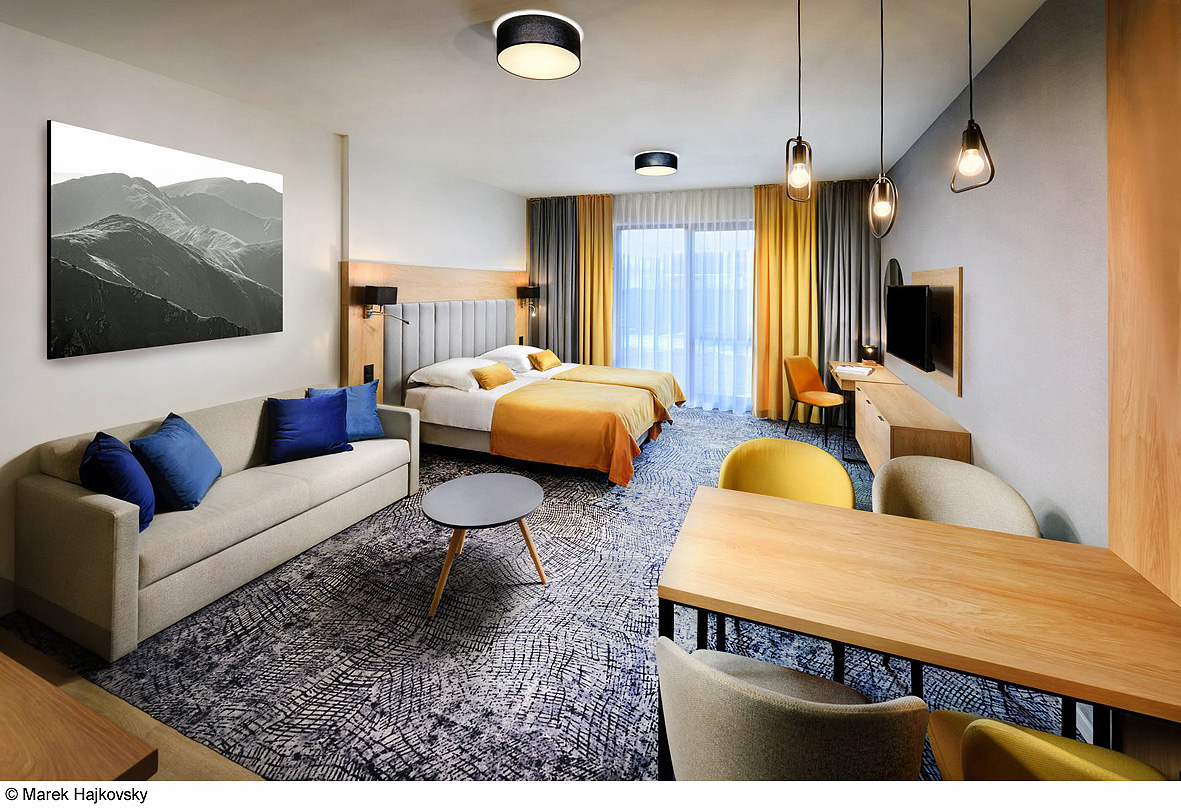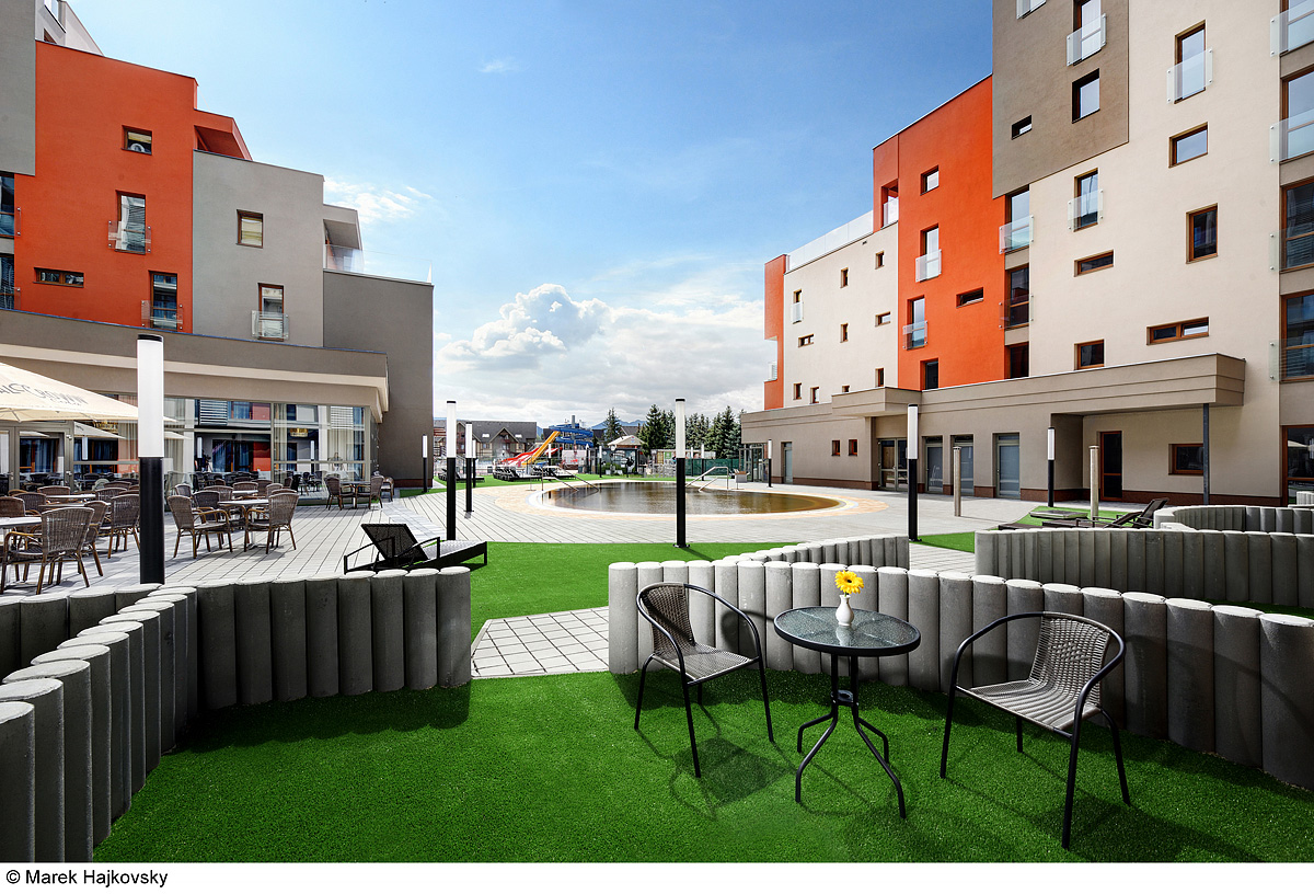 ložnice s manželskou postelí s oddělitelnými lůžky, obývací pokoj s kuchyňským koutem a jídelním stolem s rozkládacím gaučem pro 2 osoby, 2 x sociální zařízení se sprchou, privátní terasa; 9. podlaží s panoramatickým výhledem na vodní park a okolní krajinu