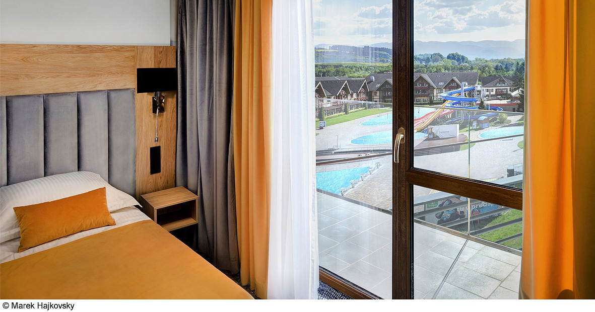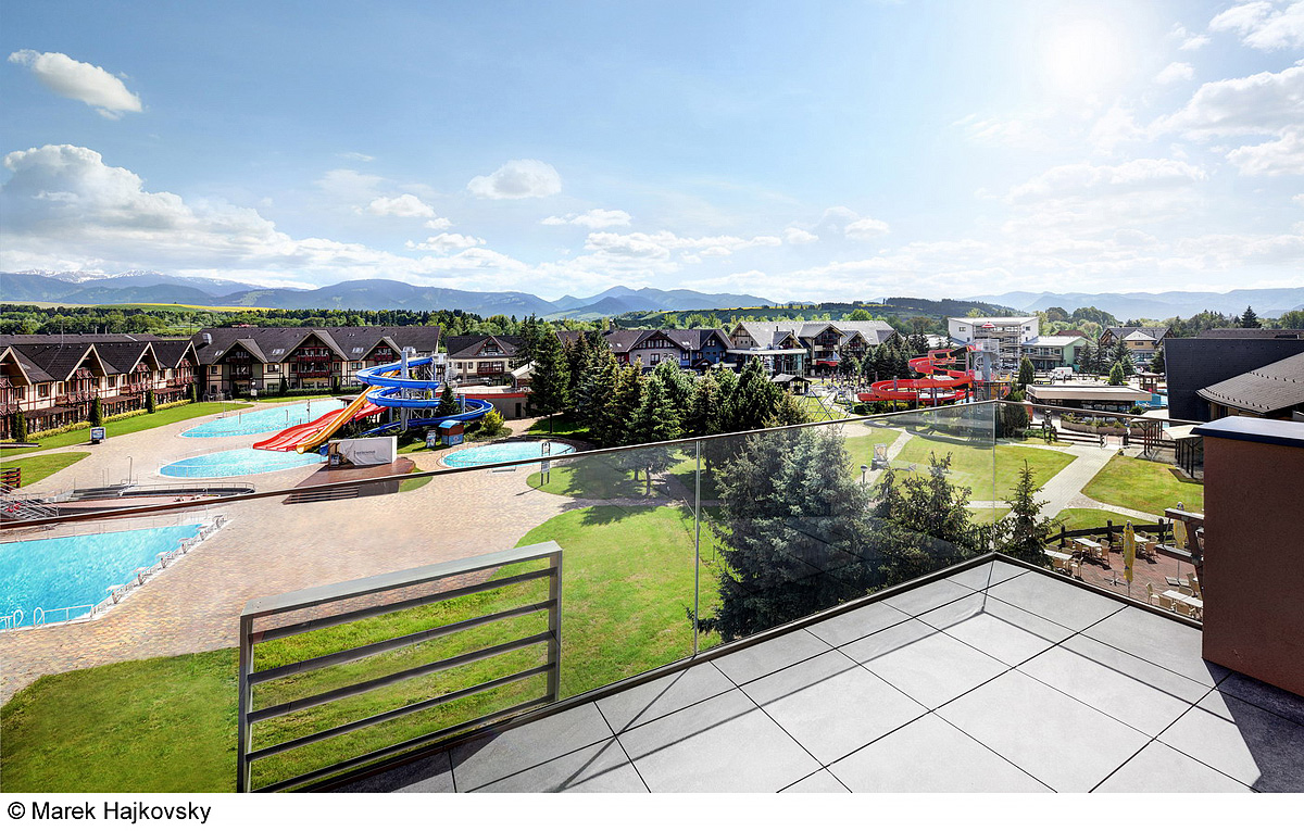 hotel se nachází přímo v areálu termálního Aquaparku Bešeňová a má exteriérový privátní termální bazén