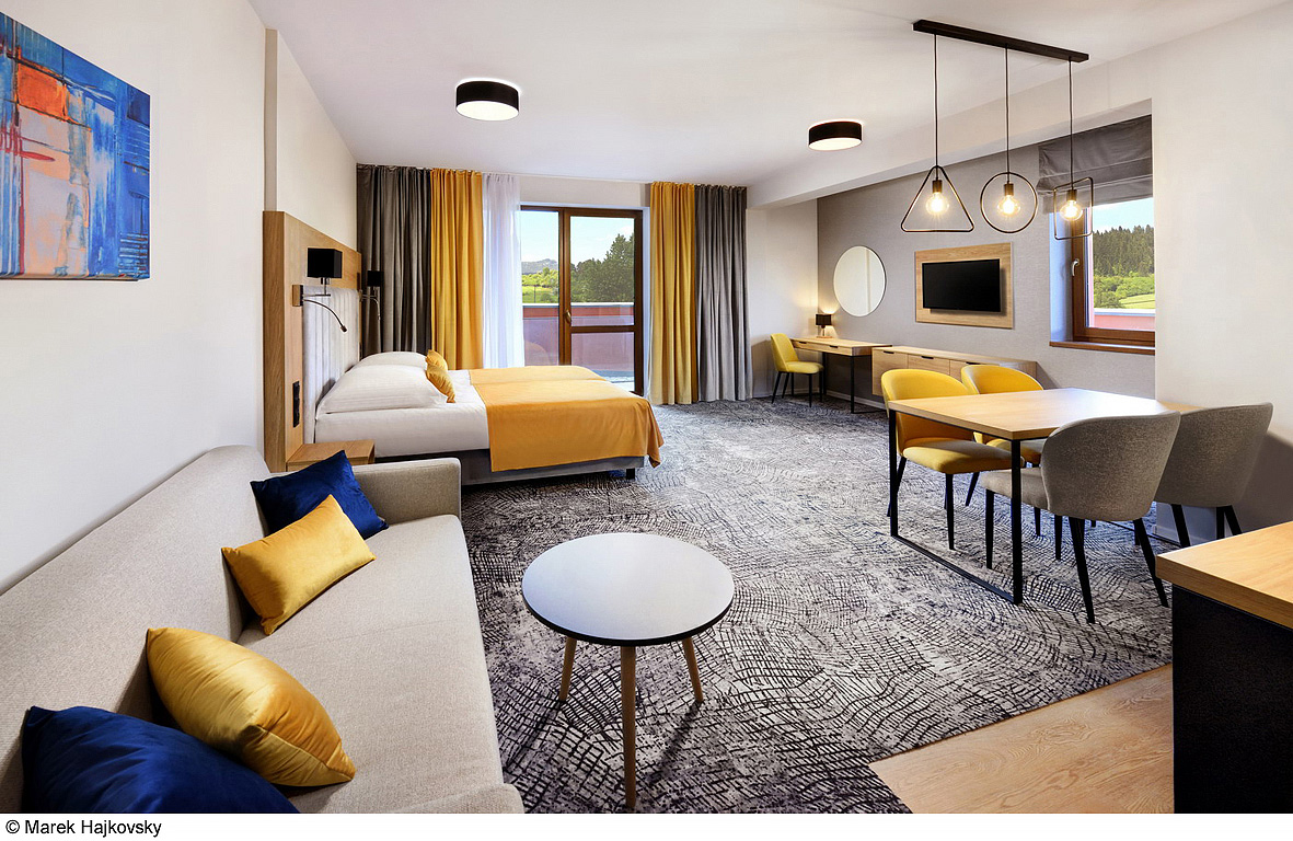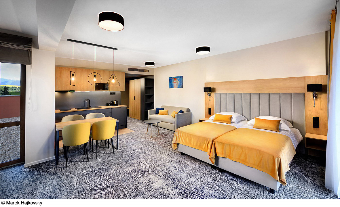 klimatizovaný pokoj s kuchyňským koutem a jídelním stolem, manželskou postelí s oddělitelnými lůžky a rozkládacím gaučem pro 2 osoby, sociální zařízení se sprchou, prostorná sluneční terasa s výhledem na vodní park Bešeňová