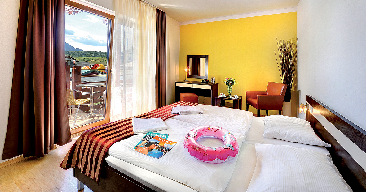 20 m² – view – pokoj s manželskou postelí či s oddělitelnými lůžky a rozkládacím křeslem formou přistýlky pro 1 dítě do nedovršených 12 let, sociální zařízení, výhled do vodního parku