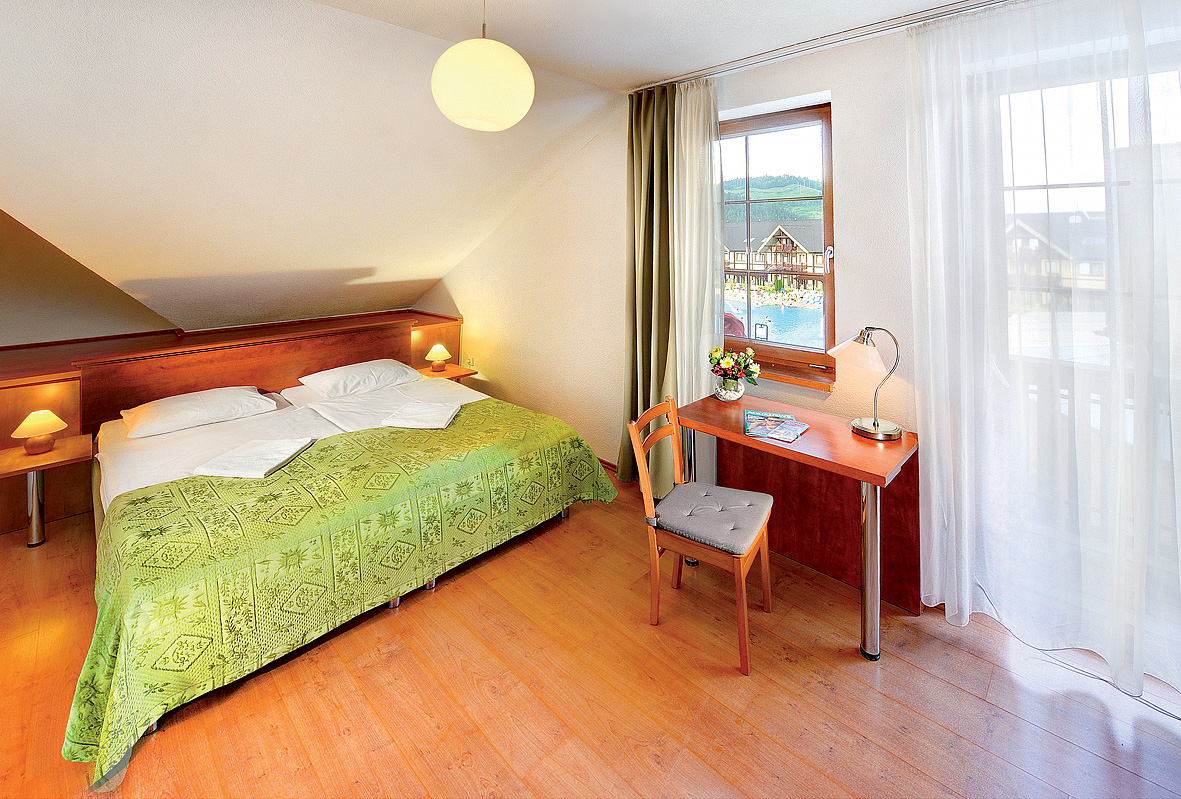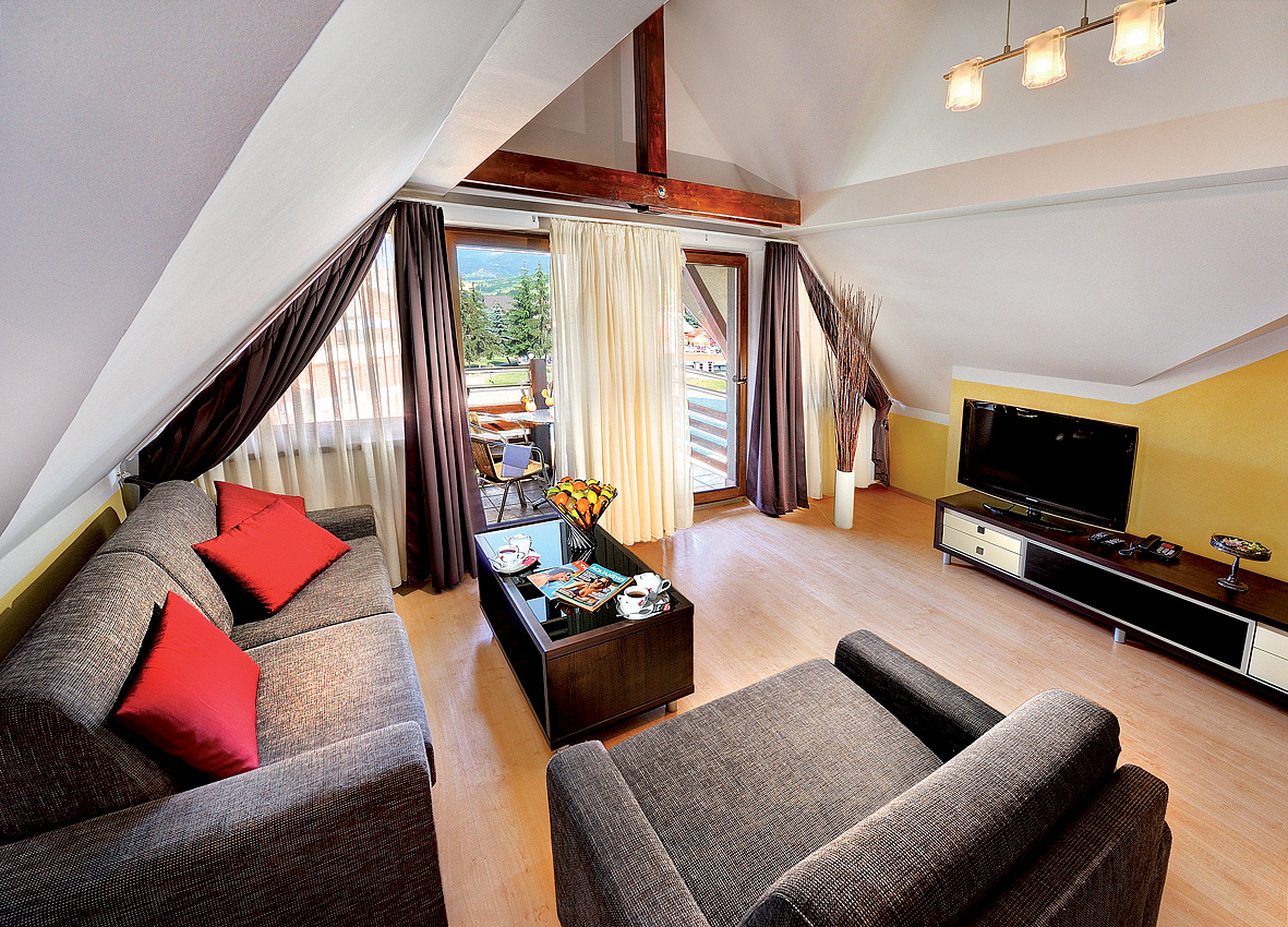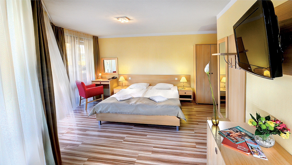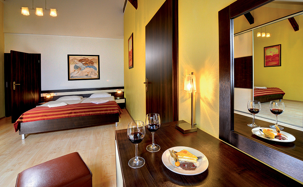 TV sat., telefon, fén, trezor, malá lednice, set na kávu a čaj, osušky a župany do vodního parku