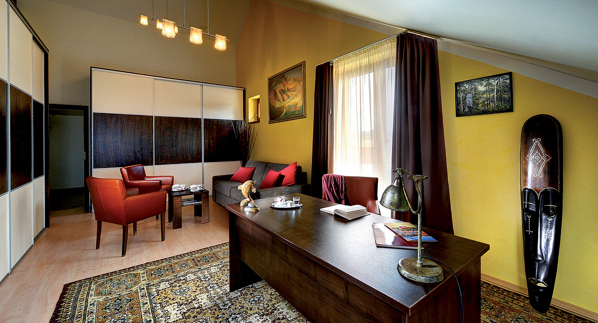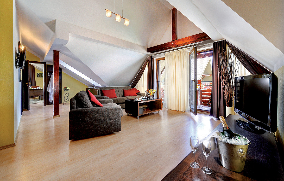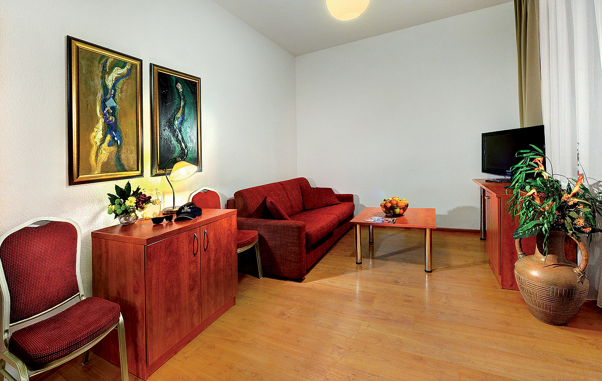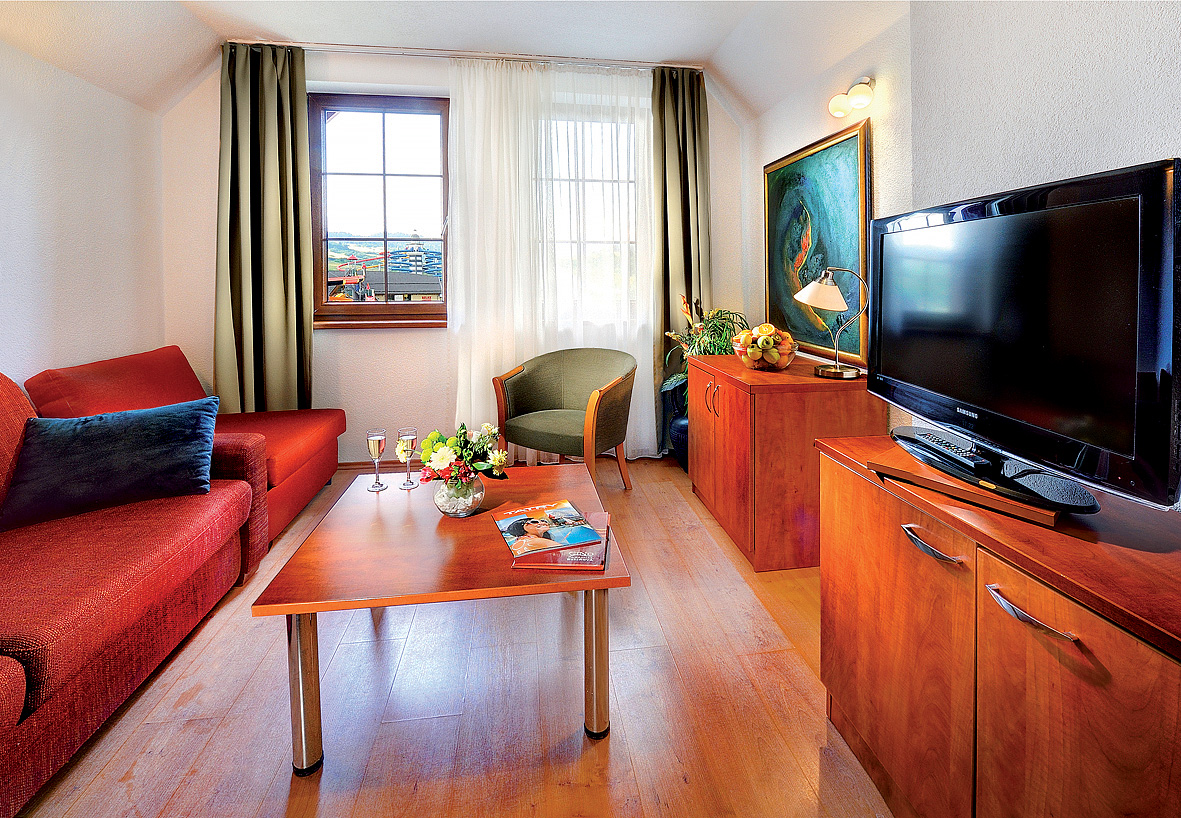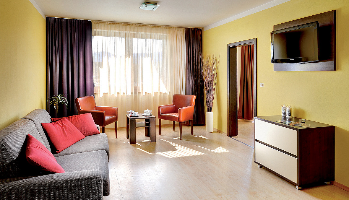 TV sat., telefon, fén, trezor, malá lednice, set na kávu a čaj, osušky a župany do vodního parku