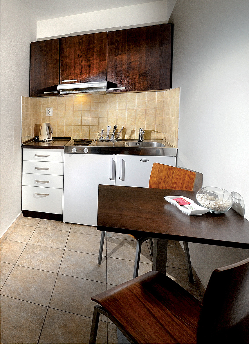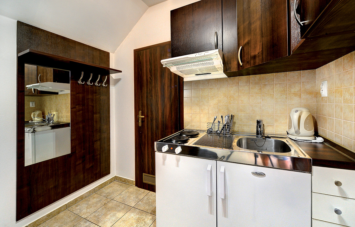 32 m²- pokoj s manželskou postelí a rozkládacím gaučem formou přistýlky až pro 2 děti do nedovršených 12 let, samostatný kuchyňský kout, sociální zařízení, balkon s výhledem do vodního parku pokoje se nachází v budově bez výtahu