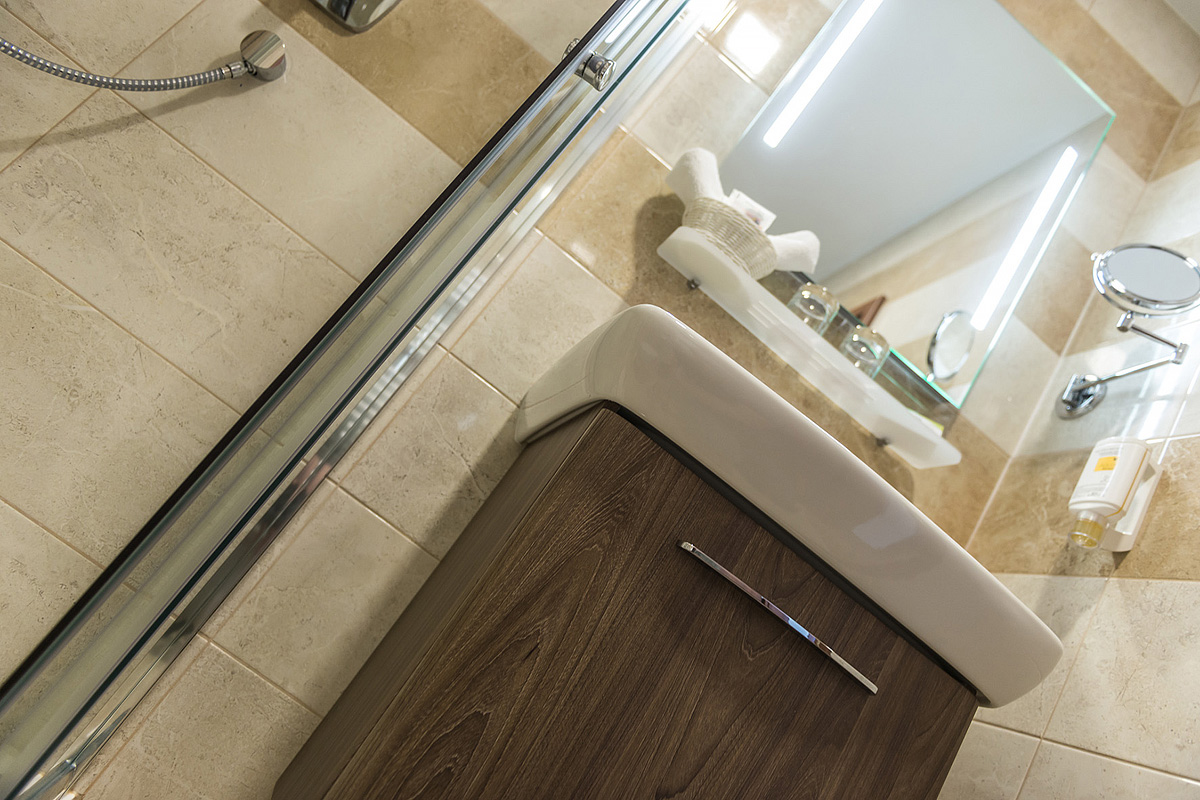 23 m² - pokoj s manželskou postelí a možností 1 přistýlky, sociální zařízení se sprchou, balkon s výhledem na bazény a areál Thermalparku