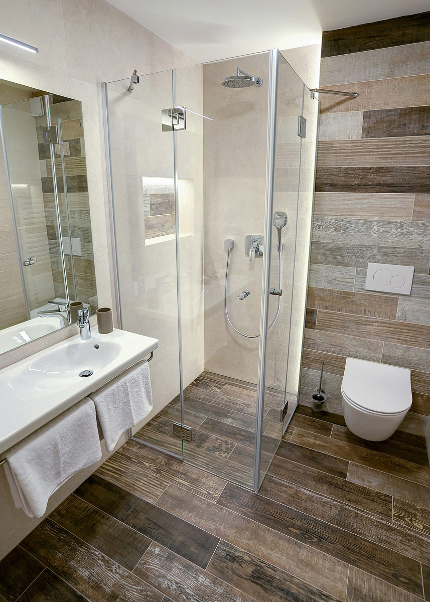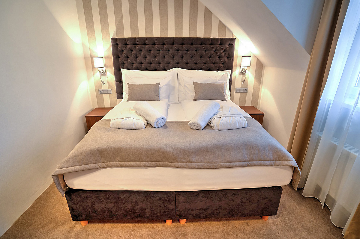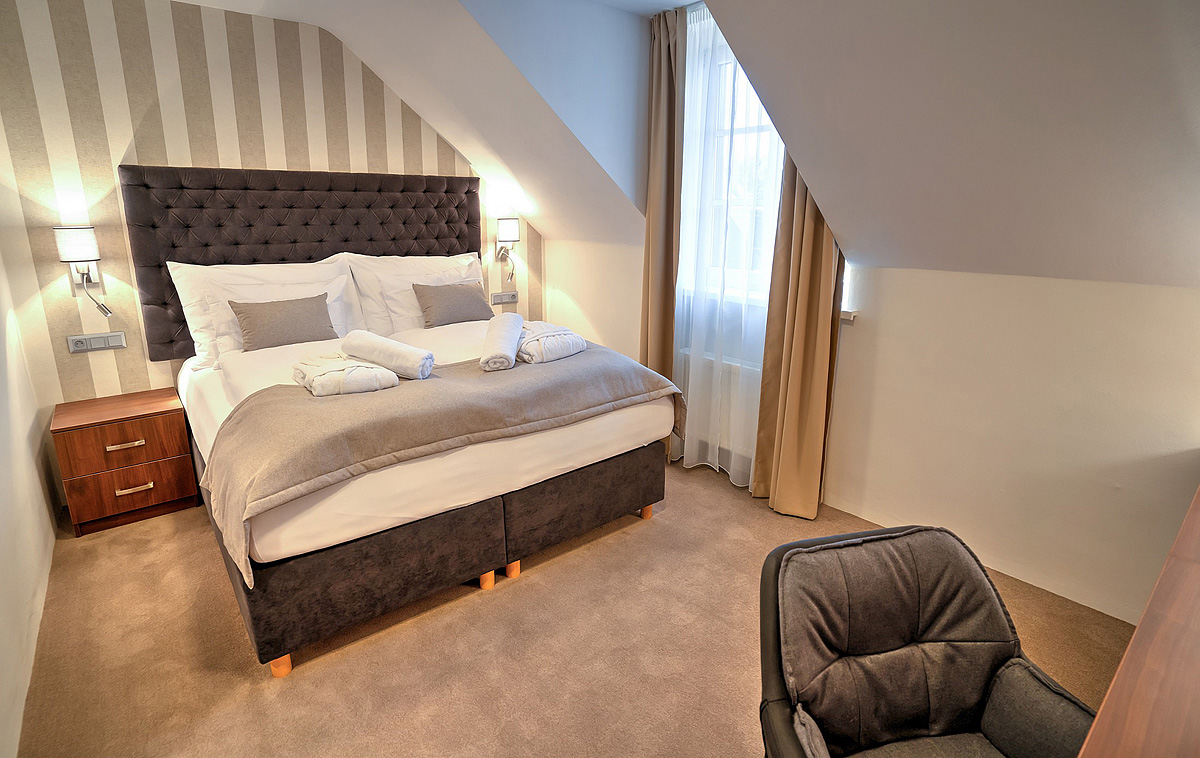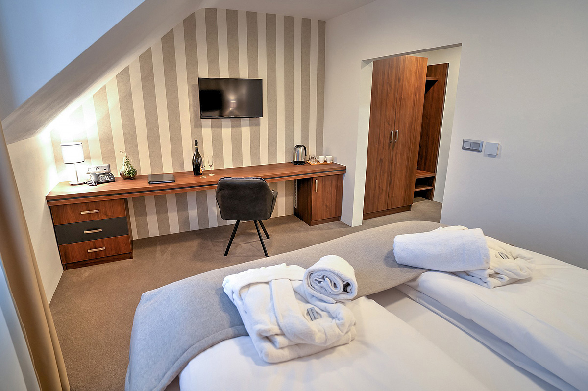 23 m² - pokoj s manželskou postelí (šířka 180 cm) nebo se 2 oddělitelnými lůžky a možností 1 přistýlky formou rozkládacího gauče, sociální zařízení se sprchou