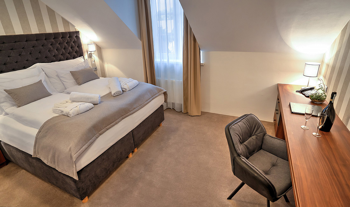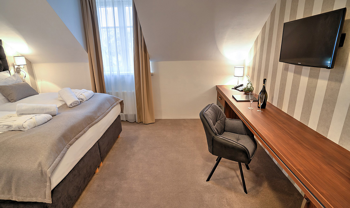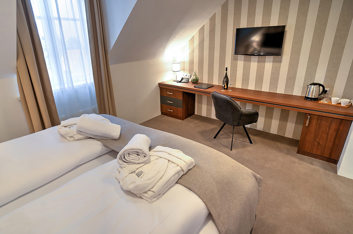 TV sat., telefon, wi-fi připojení k internetu, trezor, fén, minibar, varná konvice (set na kávu a čaj), župany a papuče