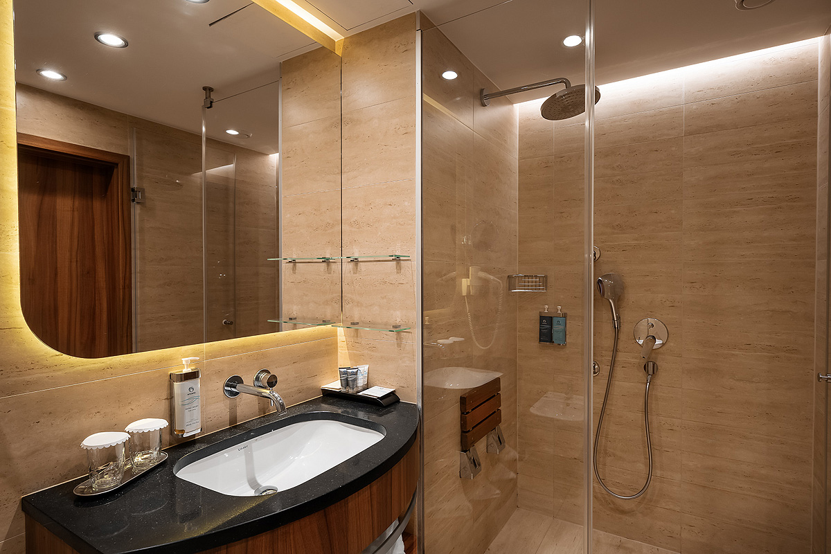 klimatizace (kromě pokojů Comfort 2+1 A, a 1 A), TV sat., telefon, wi-fi připojení k internetu, fén, chladnička, rádio (pokoje v části Esplanade), župan, trezor