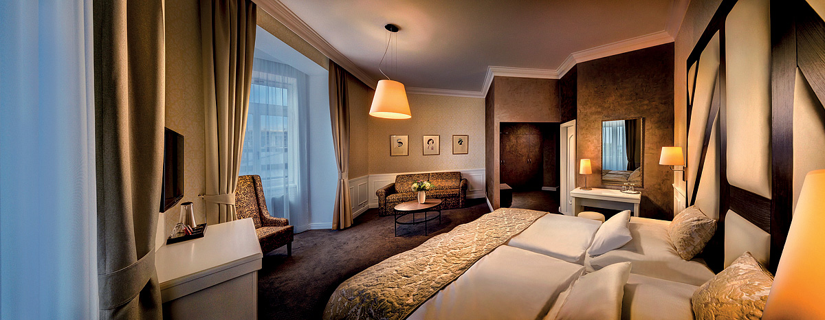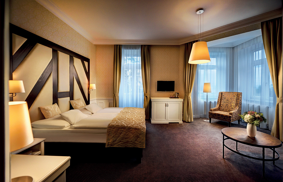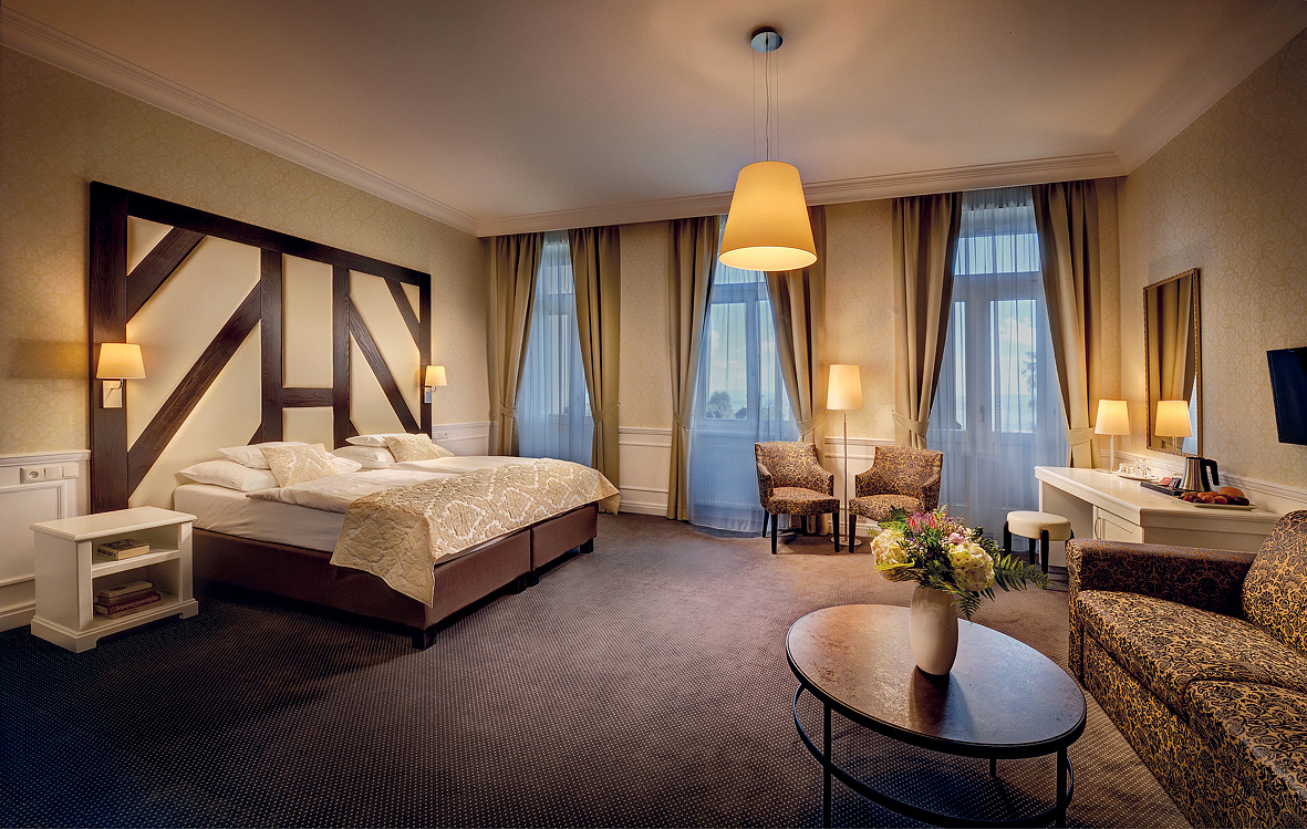 TV sat., telefon, wi-fi připojení k internetu, trezor, fén, minibar, osušky a župany do wellness, rychlovarná konvice, čajový a kávový servis; kávovar a kávový servis jen v pokojích typu Suite