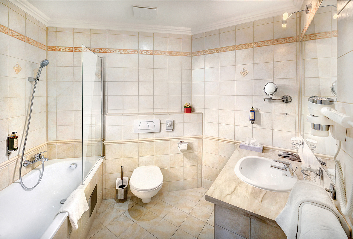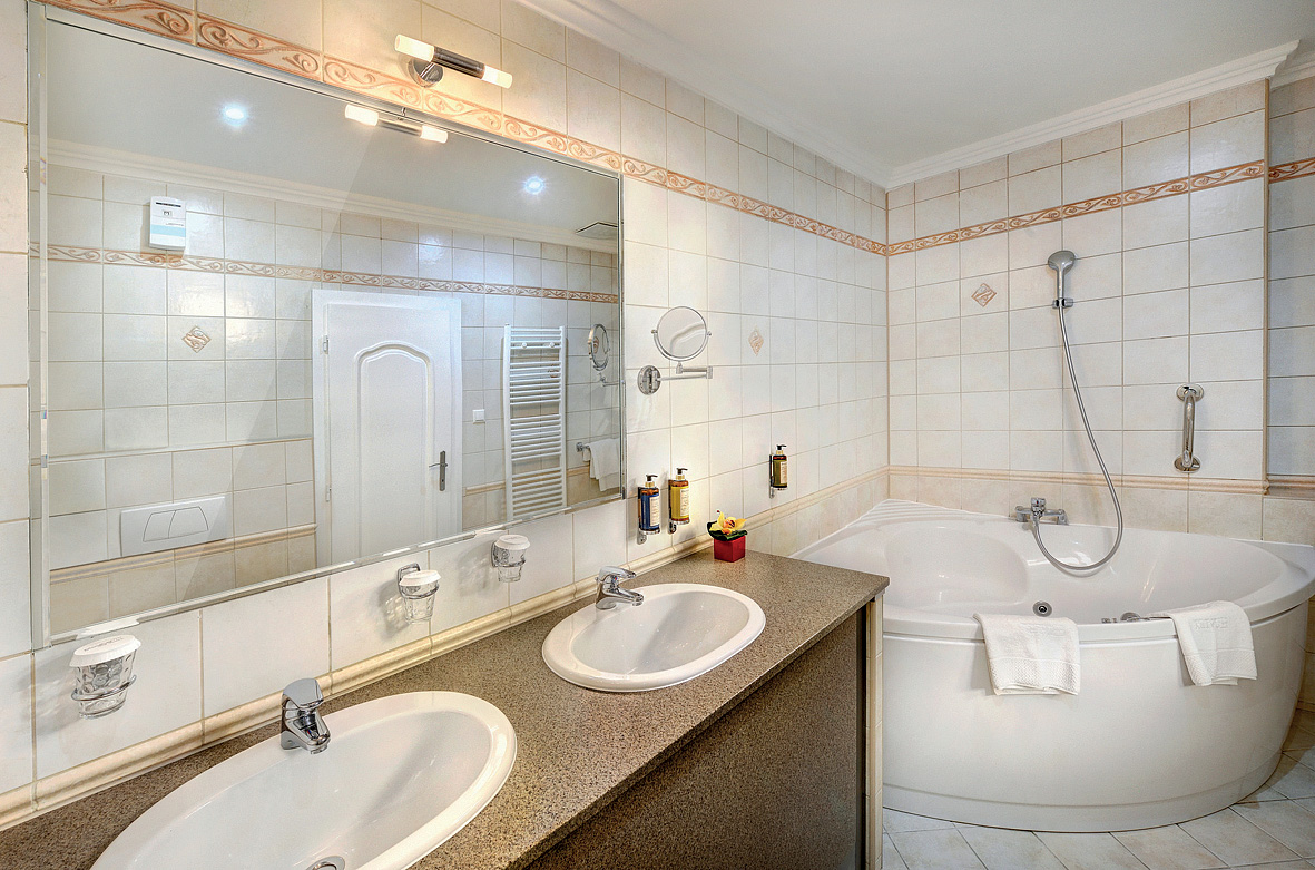 25m² větší pokoj s manželskou postelí s oddělitelnými lůžky a případně 1 či 2 přistýlkami, sociální zařízení s vanou, balkon