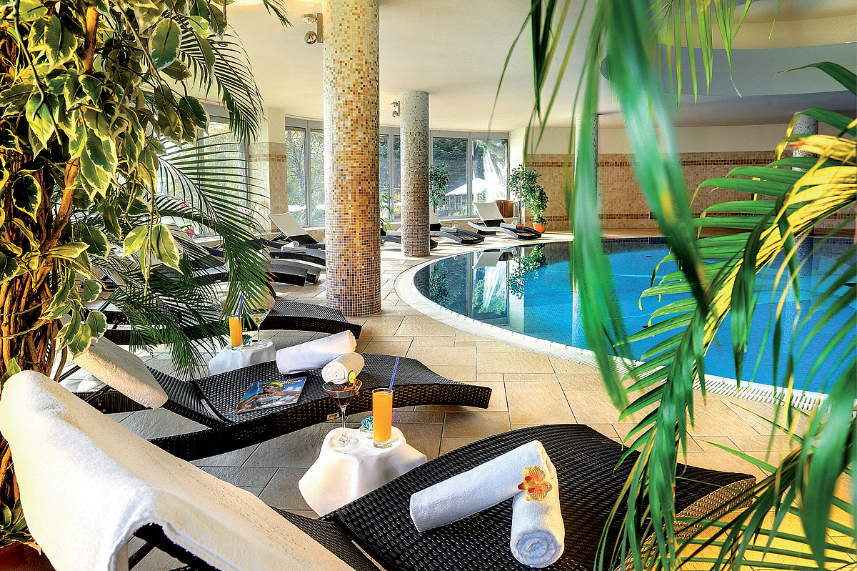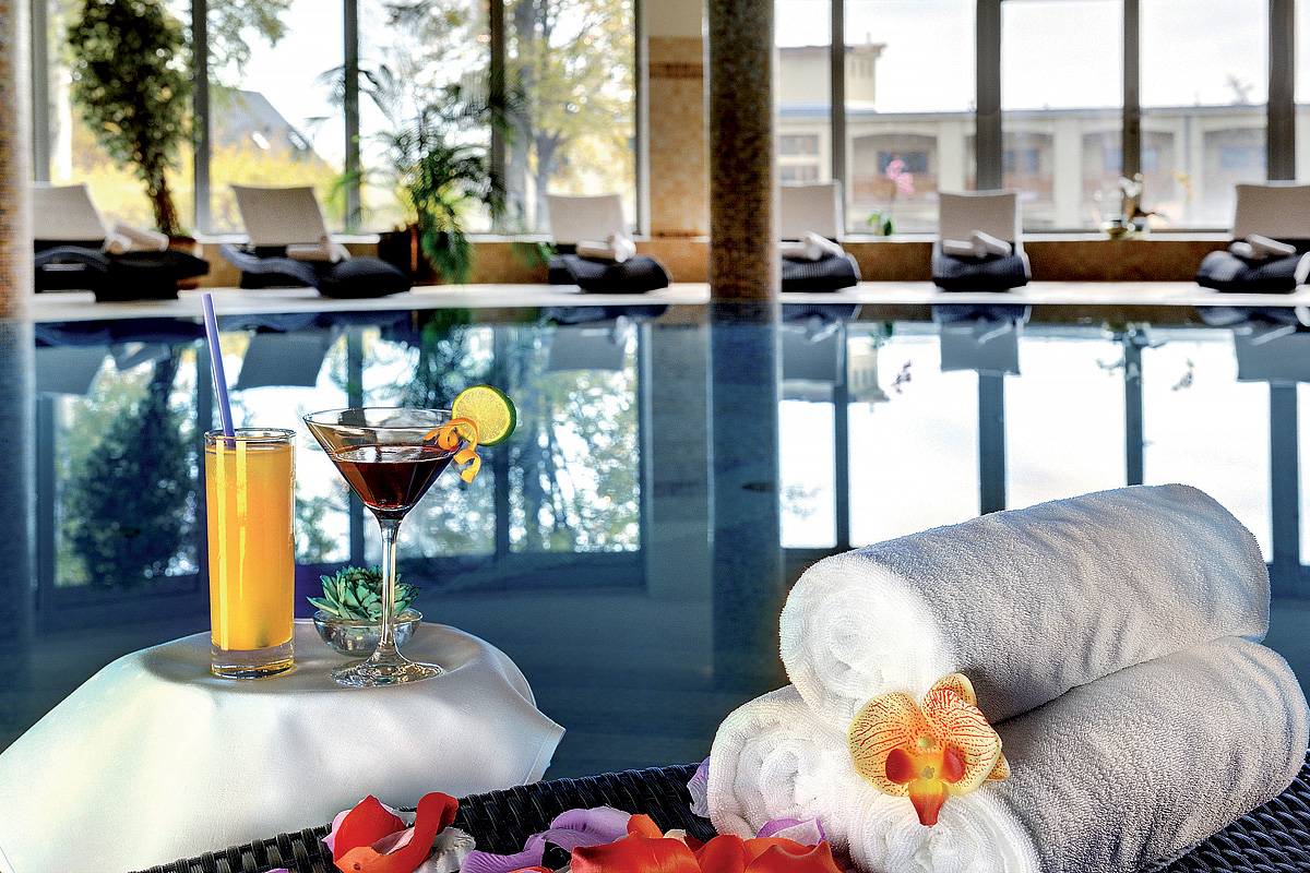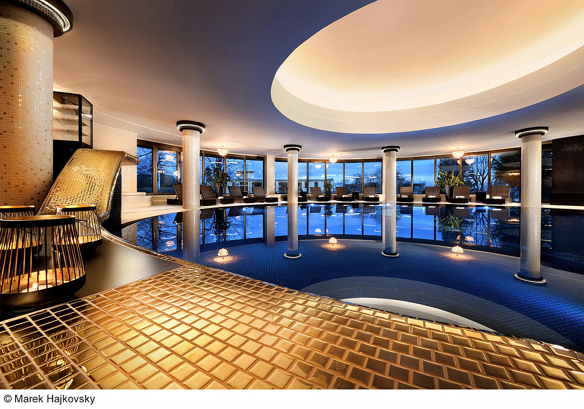 kruhový bazén o průměru 12 m s lehátky*, vířivka až pro 5 osob*, finská sauna, aromatická eukalyptová sauna, termárium, tepidárium, infrakabina, kneippův chodník, hydromasážní sprcha, masáže*, kosmetické služby*, nintendo Wii, biliár, knihovna, šachový stůl, společenské hry, šipky*, půjčovna kol*