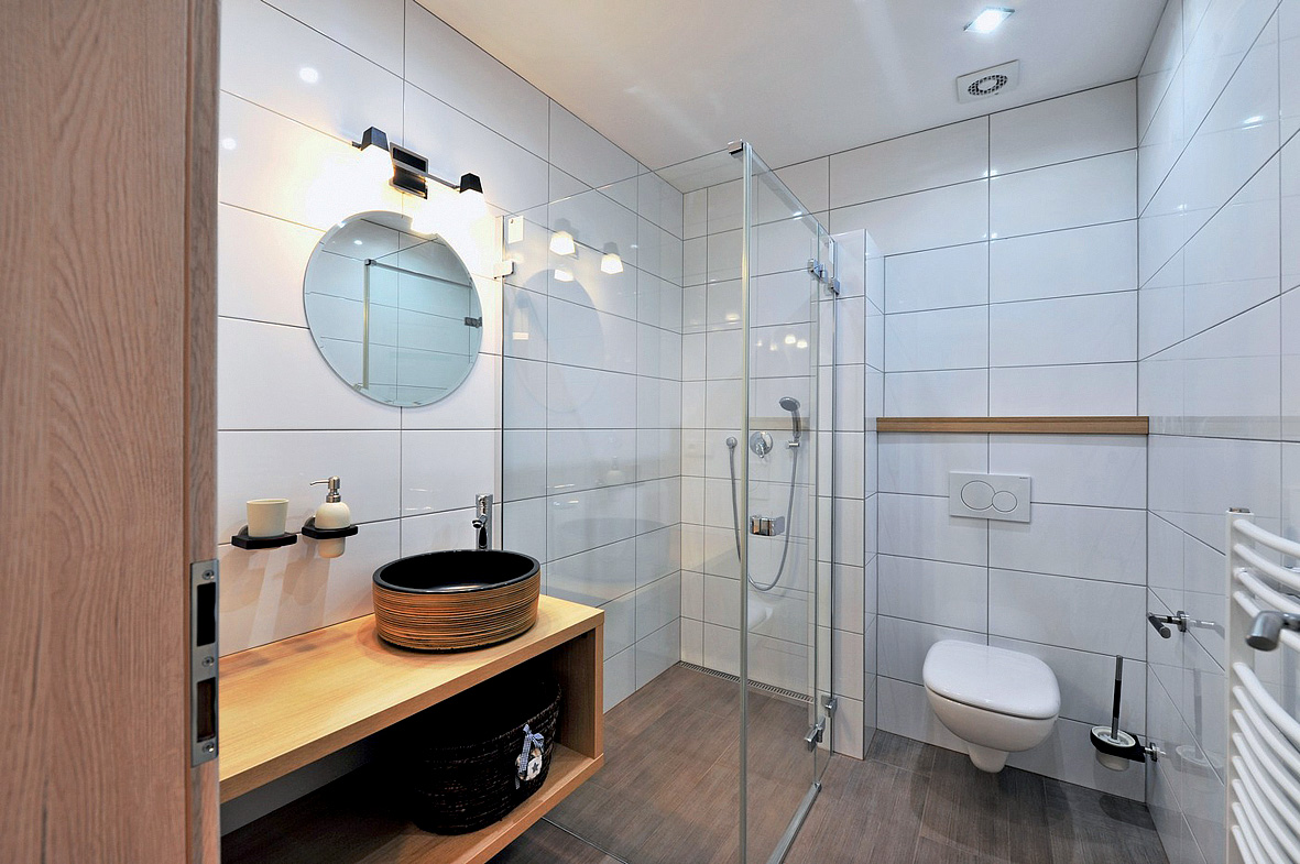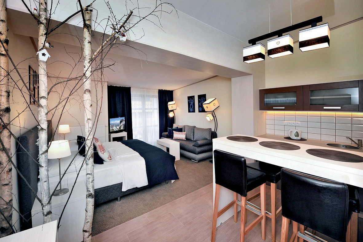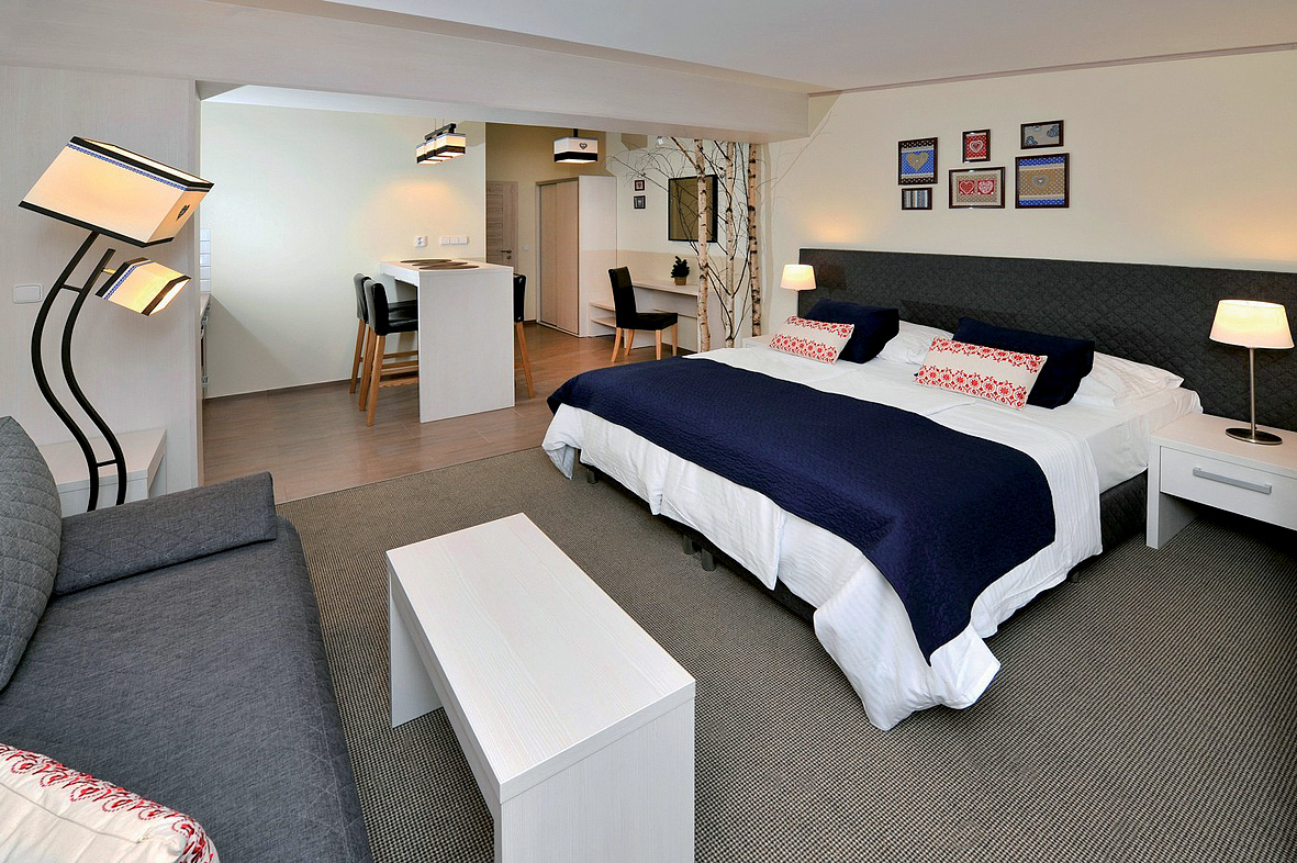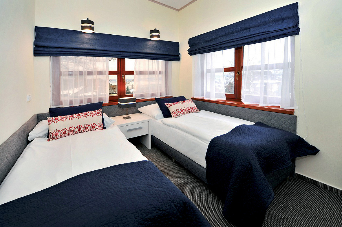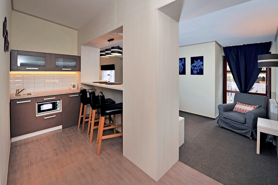 35 až 40 m² - 1 ložnice s manželskou postelí či 2 samostatnými lůžky, obývací pokoj s kuchyňským koutem a rozkládacím gaučem pro 2 osoby, předsíň, sociální zařízení