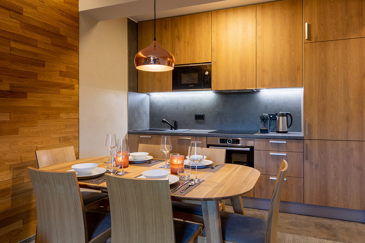 TV sat., wi-fi připojení k internetu, fén, lednice, mikrovlnná trouba, rychlovarná konvice, varná deska, myčka, kávovar; v některých apartmánech je k dispozici i automatická pračka