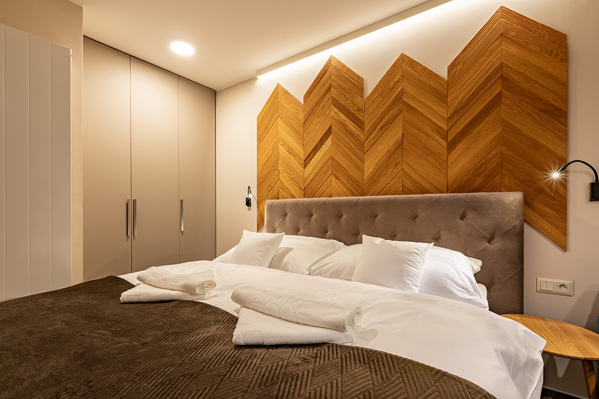 67 až 78 m² - dvě ložnice s manželskou postelí či dvěma samostatnými lůžky, obývací pokoj s rozkládacím gaučem pro 2 osoby, kuchyně, jídelní kout, sociální zařízení se sprchou, některé apartmány s balkonem