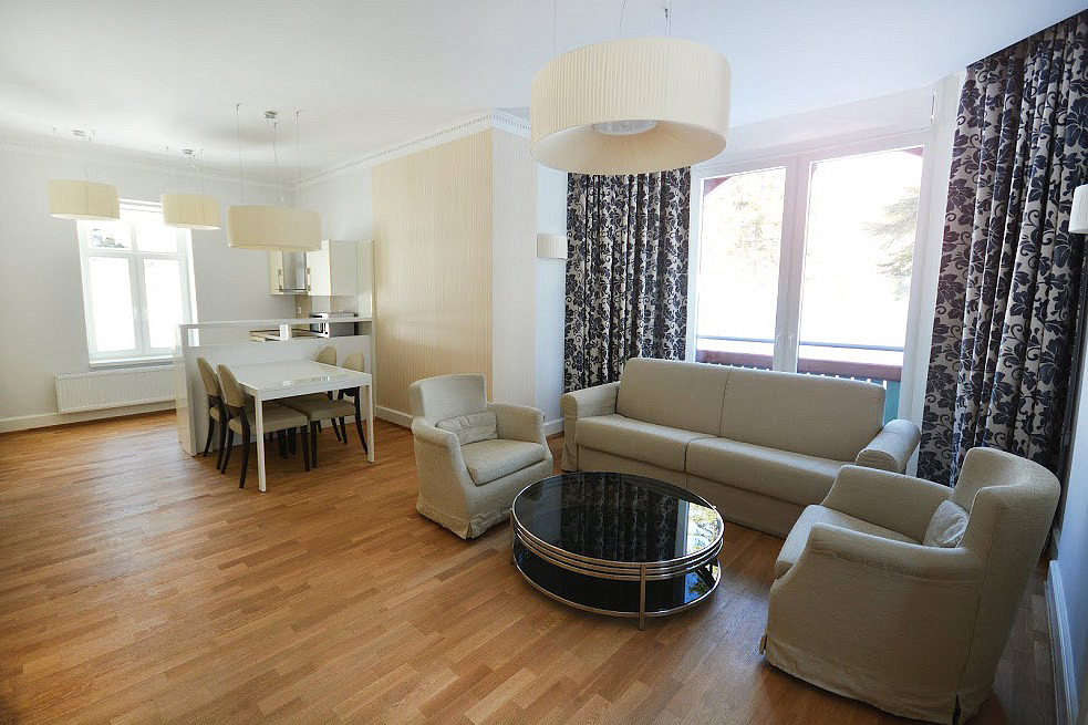 65 až 78 m² - 1 ložnice s manželskou postelí, velká obývací místnost s kuchyňským i jídelním koutem a rozkládacím gaučem pro 2 osoby, sociální zařízení s vířivou vanou