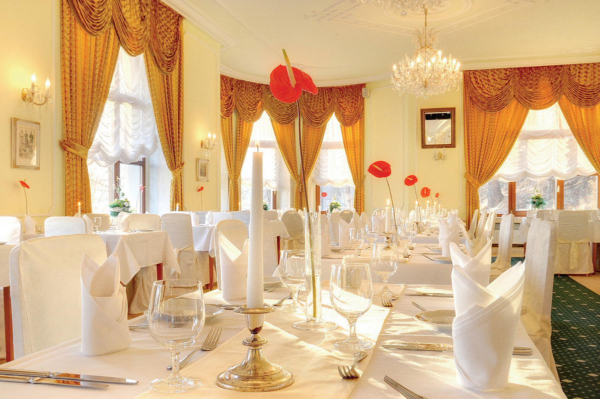 recepce / lobby, stylová restaurace, bar, wi-fi připojení k internetu, historická společenská místnost pro 100 osob pro taneční zábavy a koncerty, hudební večery (pátky a soboty), bar v rámci wellness centra, seminární místnost až pro 8 osob, kongresový sál s projekční technikou a wi-fi připojením až pro 250 osob, terasa s posezením, zahrada, dětský koutek, animační programy (pouze ve vybraných termínech), místnost pro úschovu zavazadel, vyhrazené parkoviště, nabíjecí stanice na elektroauta* (pomalé nabíjení), výtah, služby hotelové prádelny*