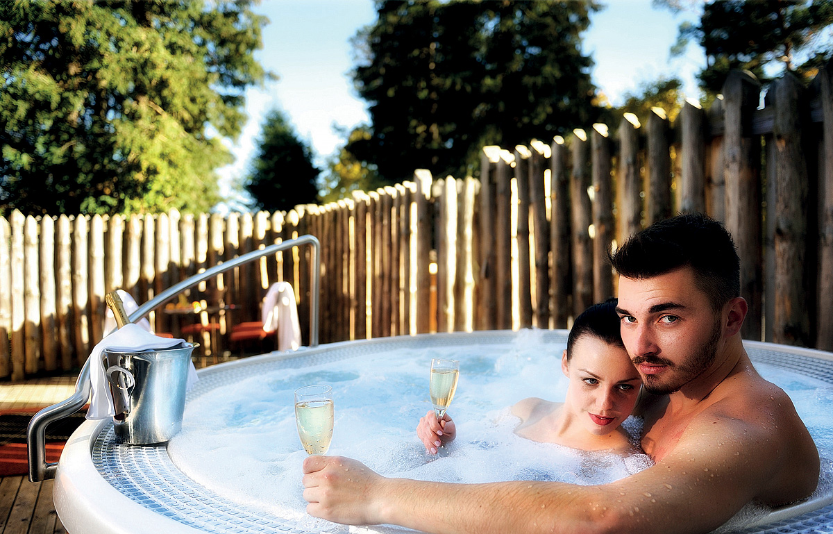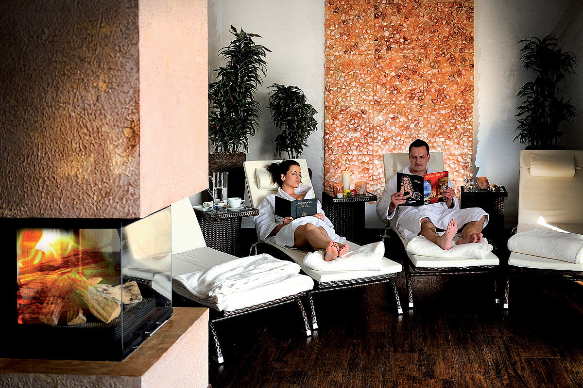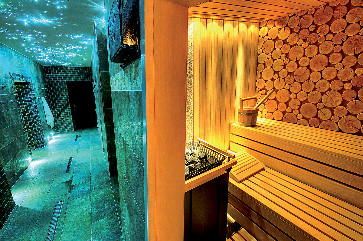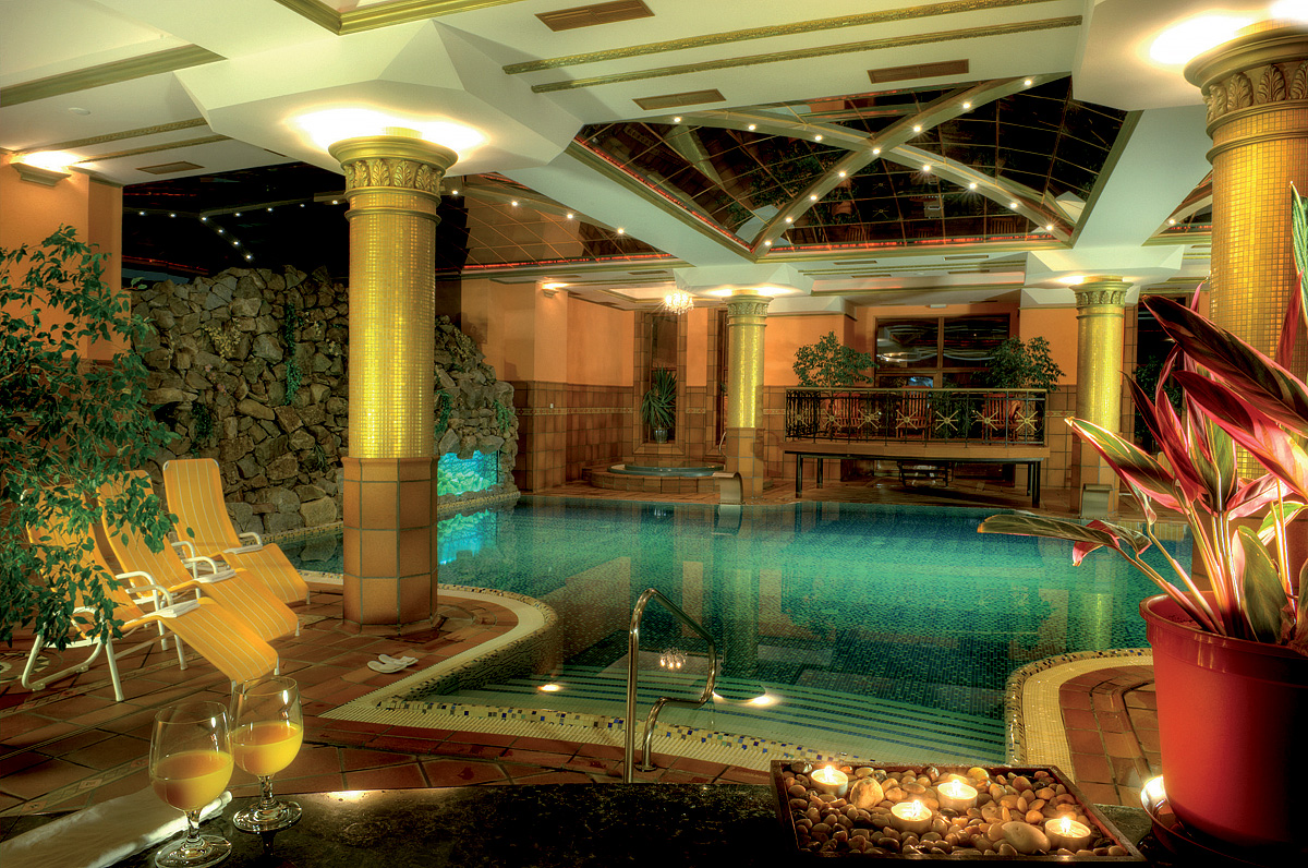 venkovní bazén 9 x 4 m s lehátky, vnitřní bazén 10 x 5 m s lehátky,1 vnitřní a 1 venkovní finská sauna, venkovní vířivka až pro 8 osob, termárium, infrakabina, pára, hydromasážní sprcha, masáže*, lázeňské kúry*, půjčovna jízdních kol*, posilovací koutek s TV, venkovní obří šachy
