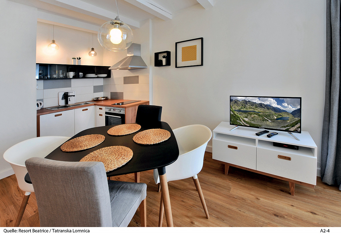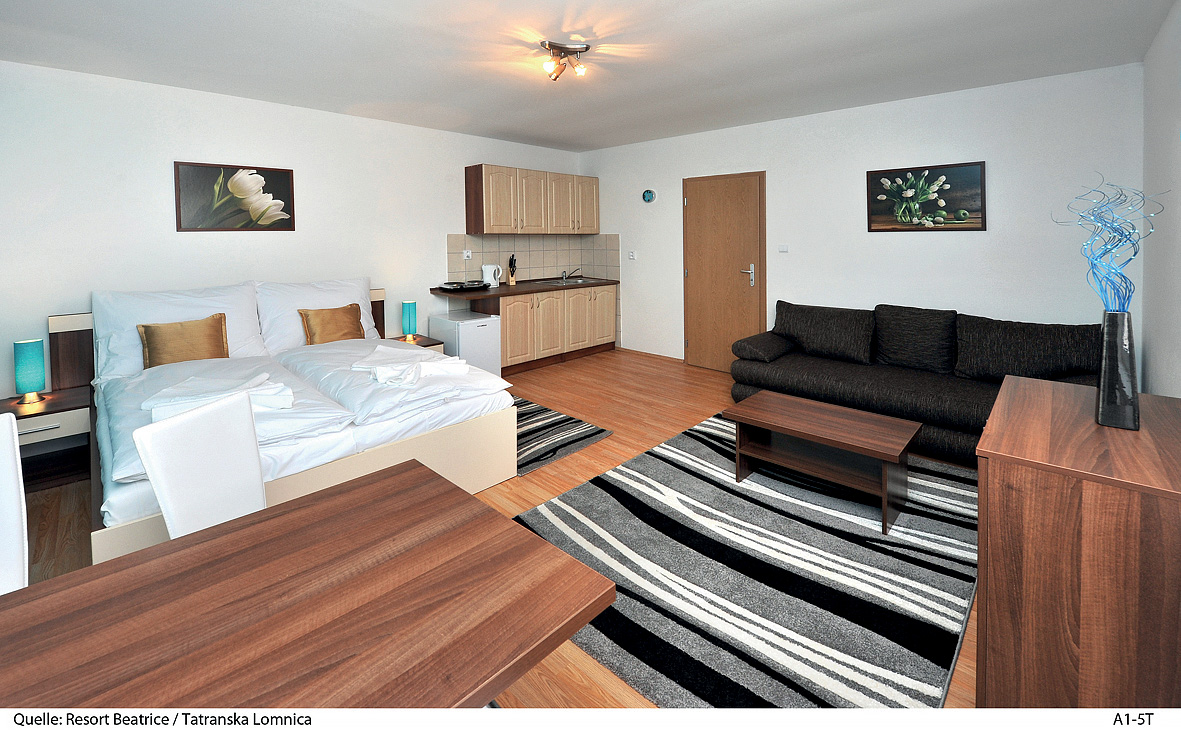 28 m² - obývací část apartmánu s rozkládacím gaučem pro 2 osoby či manželskou postelí, kuchyně, jídelní kout, sociální zařízení se sprchou