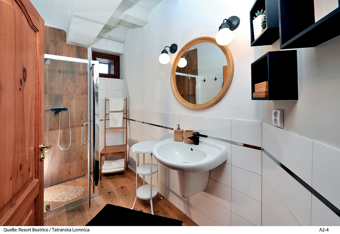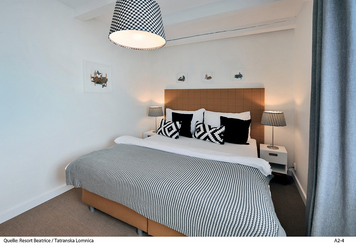 25-40 m² - obývací pokoj s kuchyňským koutem a rozkládacím gaučem pro 2 osoby, ložnice s manželskou postelí (může být i formou mezonetu), sociální zařízení zpravidla se sprchou, z 50% balkon
