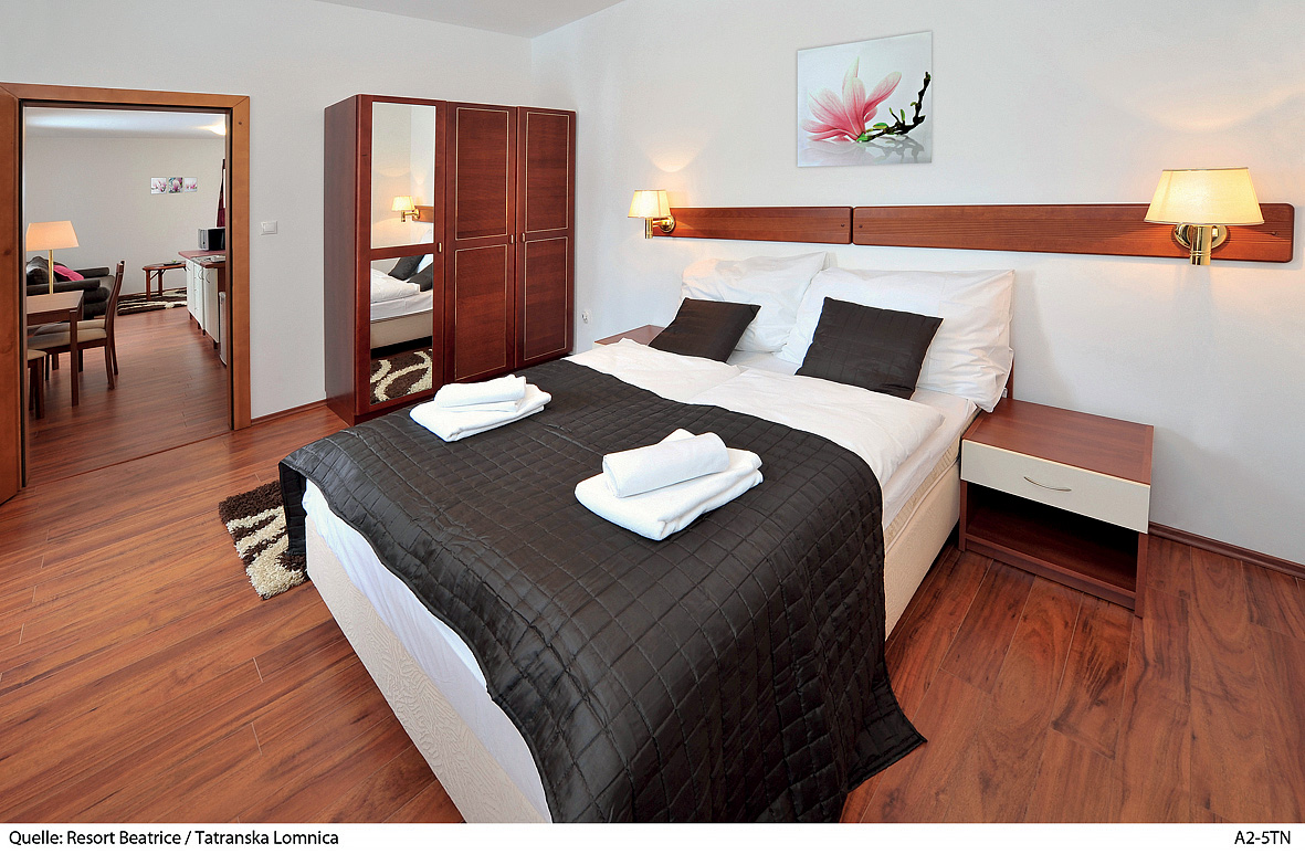 65 m² - ložnice s manželskou postelí, obývací pokoj se 2 oddělitelnými lůžky, rozkládacím gaučem pro 2 osoby, kuchyně, jídelní kout, sociální zařízení s vanou, některé apartmány i s balkonem