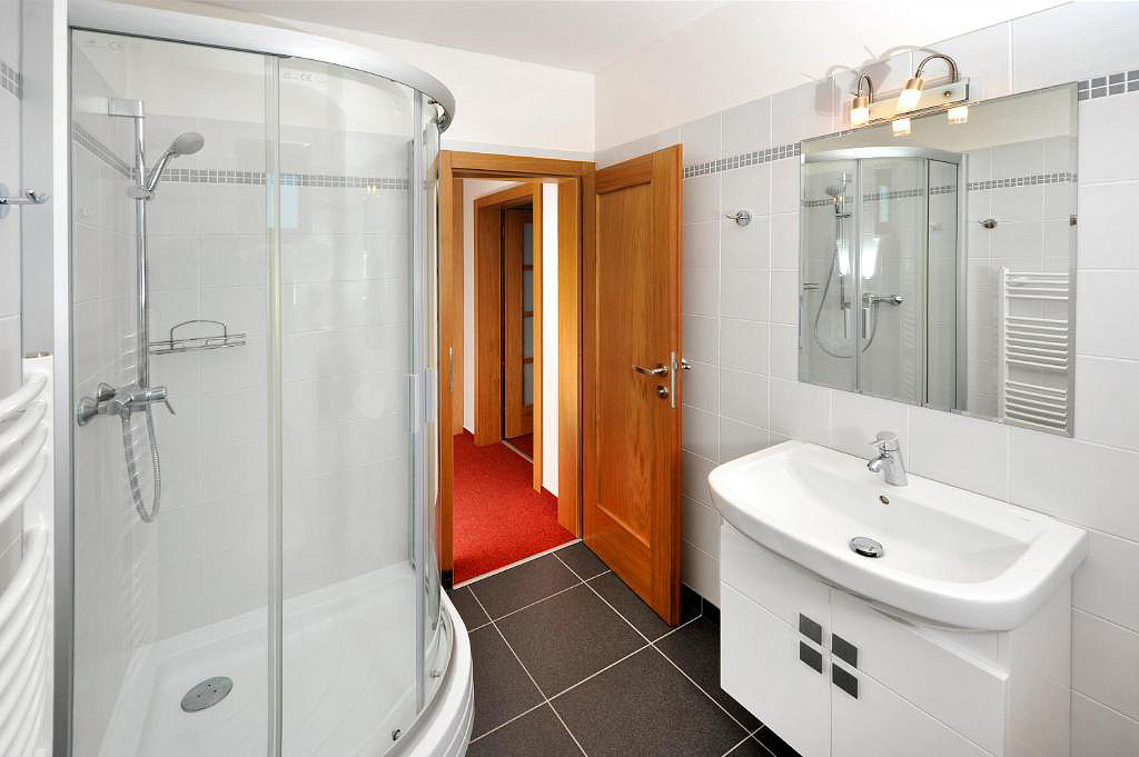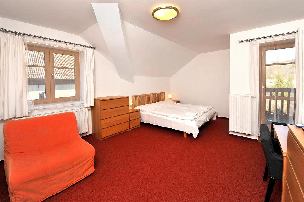 pokoj s manželskou postelí a případně 2x samostatním lůžkem či 2x přistýlkou, sociální zařízení se sprchou