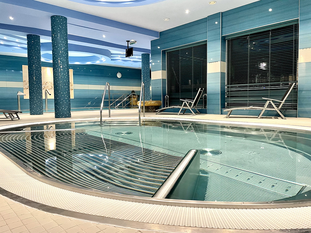 bazén* s vodními prvky a lehátky, vířivka*, finská sauna*, pára*, hammam*, relaxační koutek* s vyhřívanými ležadlami, solná kabina*, masáže*, beauty procedury*