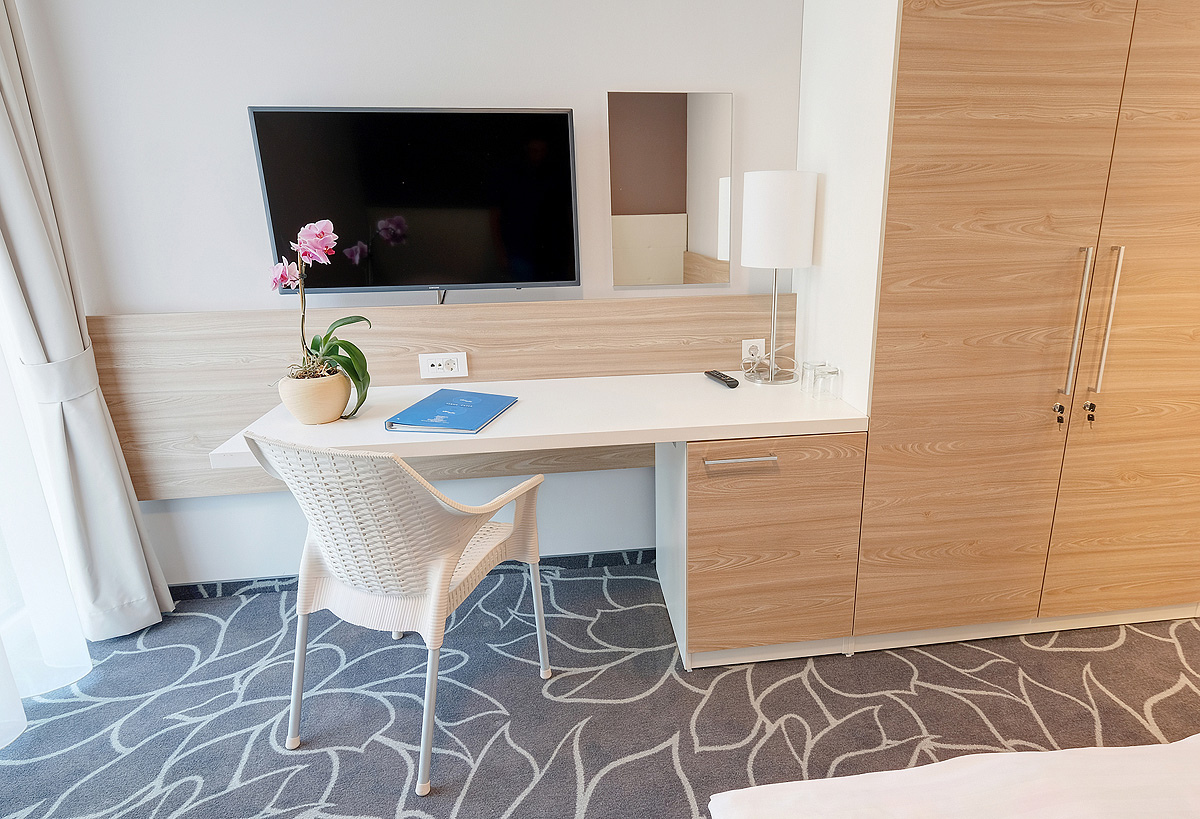 klimatizace, TV, telefon, wi-fi připojení k internetu, fén, župan, pantofle, minibar