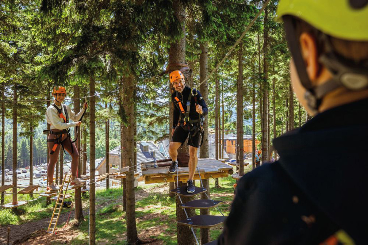 adrenalinový lanový park: různé úrovně obtížnosti s více než 60 překážkami, ziplinou a 500 m dlouhá stezka korunami stromů