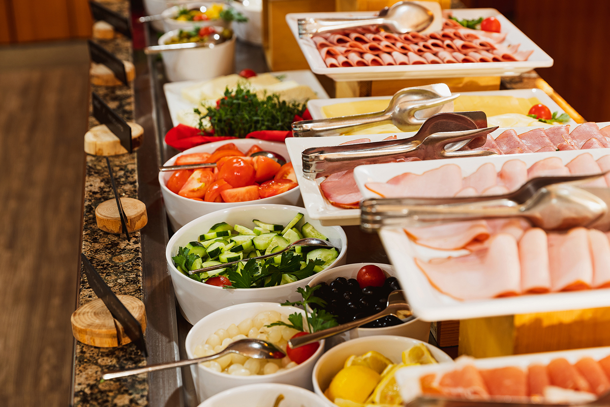 formou mezinárodního bufetu v hotelové restauraci; nápoje za poplatek