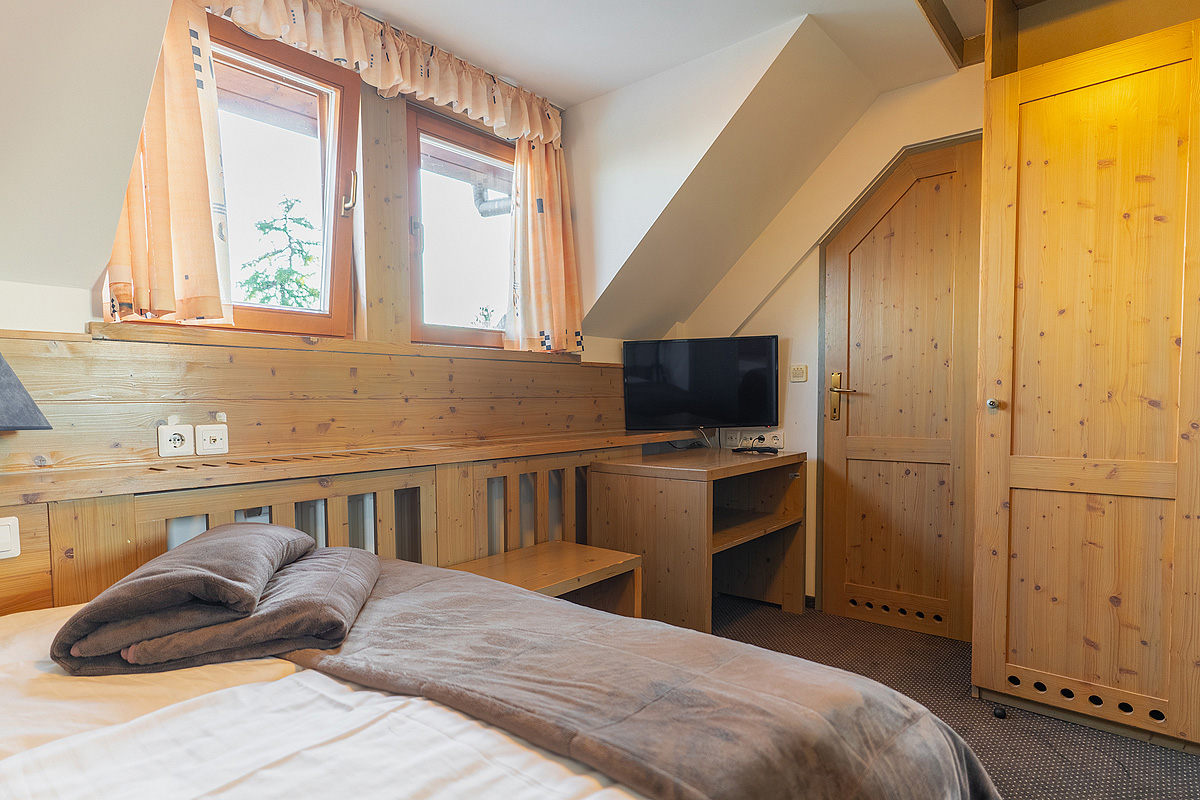 20 až 28 m² - pokoj se samostatným lůžkem či manželskou postelí a případně rozkládací pohovka pro 1 osobu či rozkládací pohovka o velikosti 1,5 běžného lůžka (vhodné až pro 2 děti do 12 let), sociální zařízení, zřídka balkon