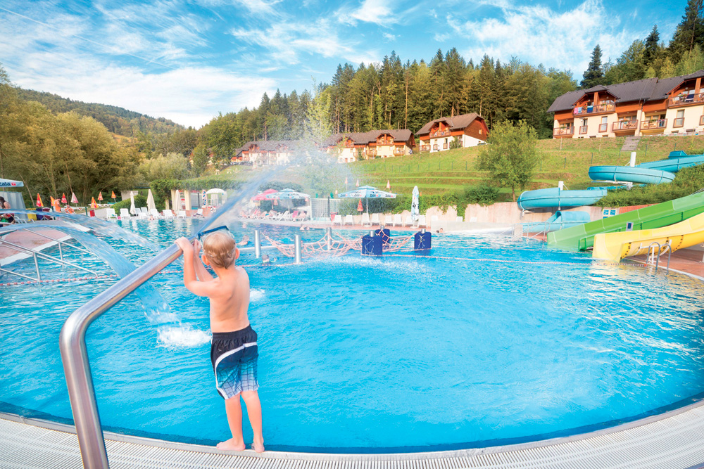 venkovní bazén# s teplotou 26°C až 28°C, tobogánem a lehátky, vnitřní termální bazén# s teplotou 32° až 36°C, vířivkou# až pro 10 osob a lehátky#, dětský bazén#, sauna*, pára*, relaxační koutek* s lehátky, fontána na led*, bazének* se studenou vodou, Kneippův chodník*, víceúčelové hřiště; služby označené # mají 2x denně vstup zahrnut v ceně pobytu