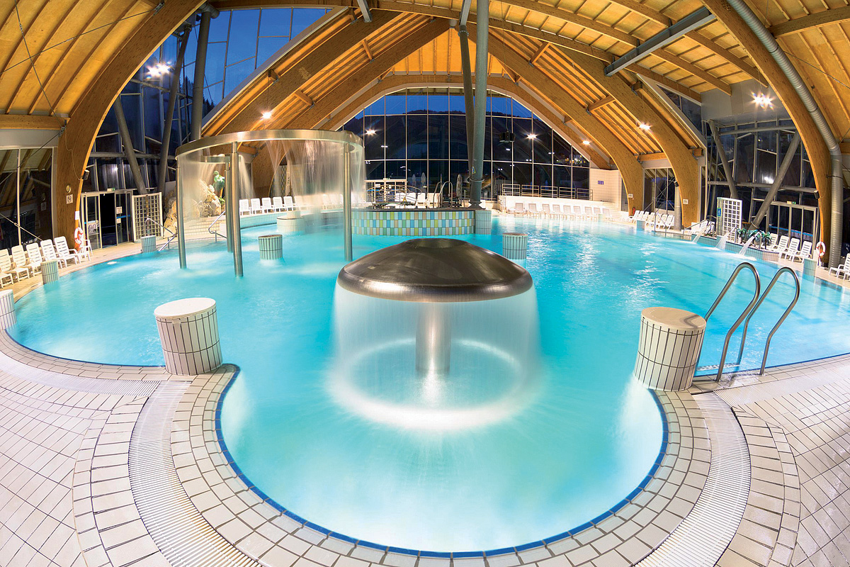 venkovní bazén# s teplotou 26°C až 28°C, tobogánem a lehátky, vnitřní termální bazén# s teplotou 32° až 36°C, vířivkou# až pro 10 osob a lehátky#, dětský bazén#, sauna*, pára*, relaxační koutek* s lehátky, fontána na led*, bazének* se studenou vodou, Kneippův chodník*, víceúčelové hřiště; služby označené # mají 2x denně vstup zahrnut v ceně pobytu