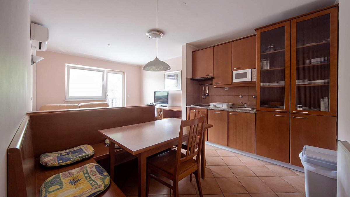 plně vybavený kuchyňský kout (varná deska, lednice, mikrovlnná trouba, myčka nádobí), topení / klimatizace, TV, telefon, wi-fi připojení k internetu, fén, ložní prádlo, ručníky, utěrky