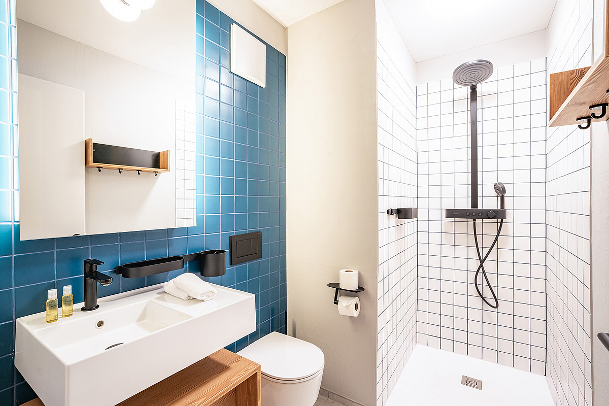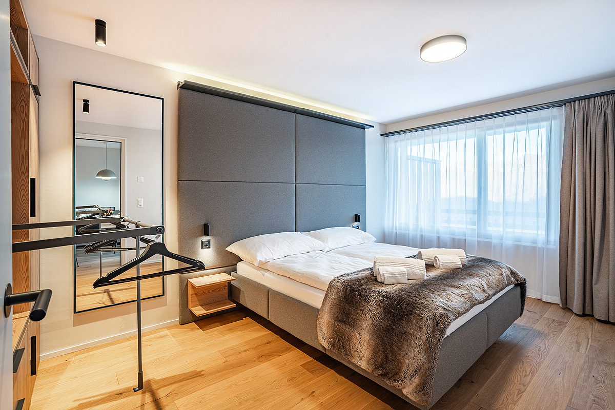 88 m² - 2 ložnice s manželskou postelí s oddělitelnými lůžky (šíře 180 cm), ložníce s palandou či 2 samostatnými lůžky, obývací pokoj s kuchyňským koutem a rozkládacím gaučem (šíře 160 cm) pro 2 osoby, 2x sociální zařízení, balkon