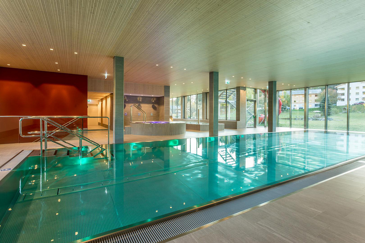 vnitřní bazén 12 x 5 m (31 °C), vnitřní dětské brouzdaliště (33 °C), venkovní koupací jezírko (vyhřívané solárními panely na 15 až 22 °C), vířivka (35 °C), finská sauna, bio sauna, relaxační koutek s lehátky, masáže*, venkovní skluzavka (tubing) a hřiště