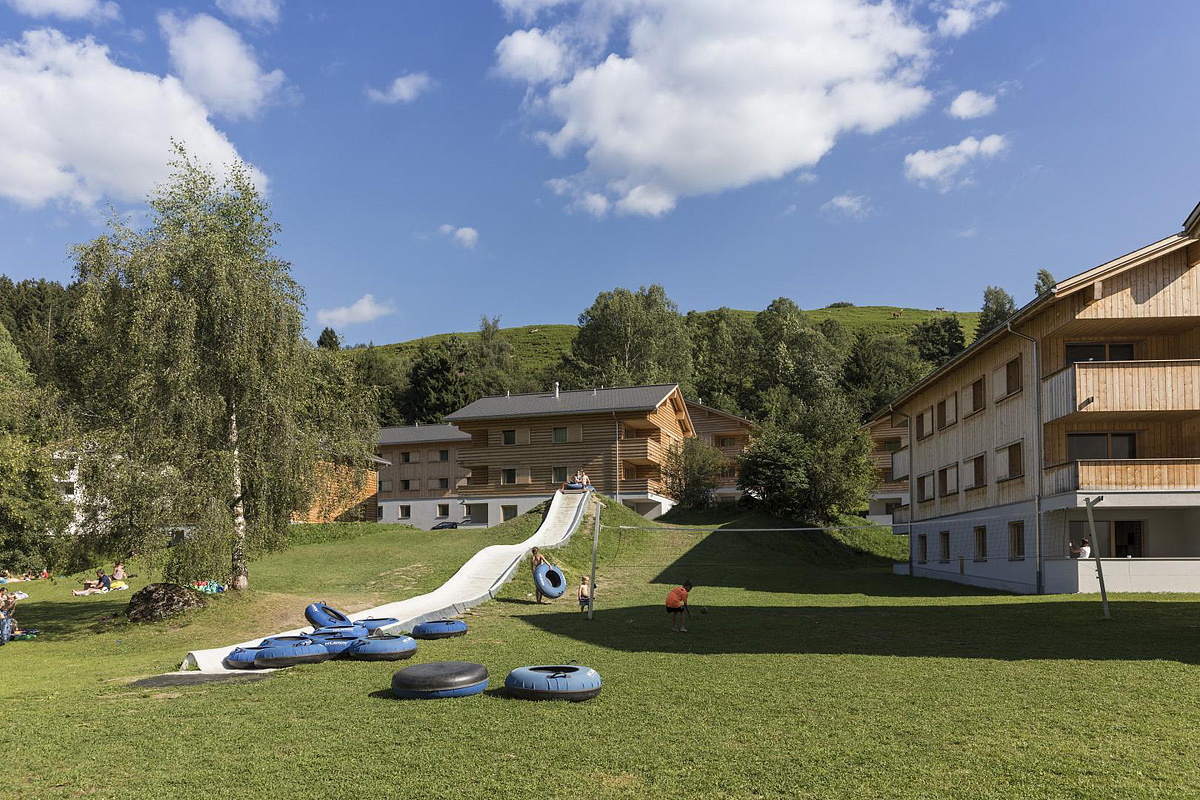 recepce, wi-fi připojení k internetu, à la carte restaurace La Famousa / sluneční terasa s posezením, dětská herna a miniclub Ravensburger, herna pro teenagery, úschovna jízdních kol, obchod se sportovním vybavením a půjčovnou* kol a elektrokol, vyhrazené parkoviště (1 parkovací místo / apartmán mono, bilo a trilo a 2 parkovací místa / apartmán quadrilo), pračka* a sušička*, donáška čerstvého pečiva*, dětské hřiště