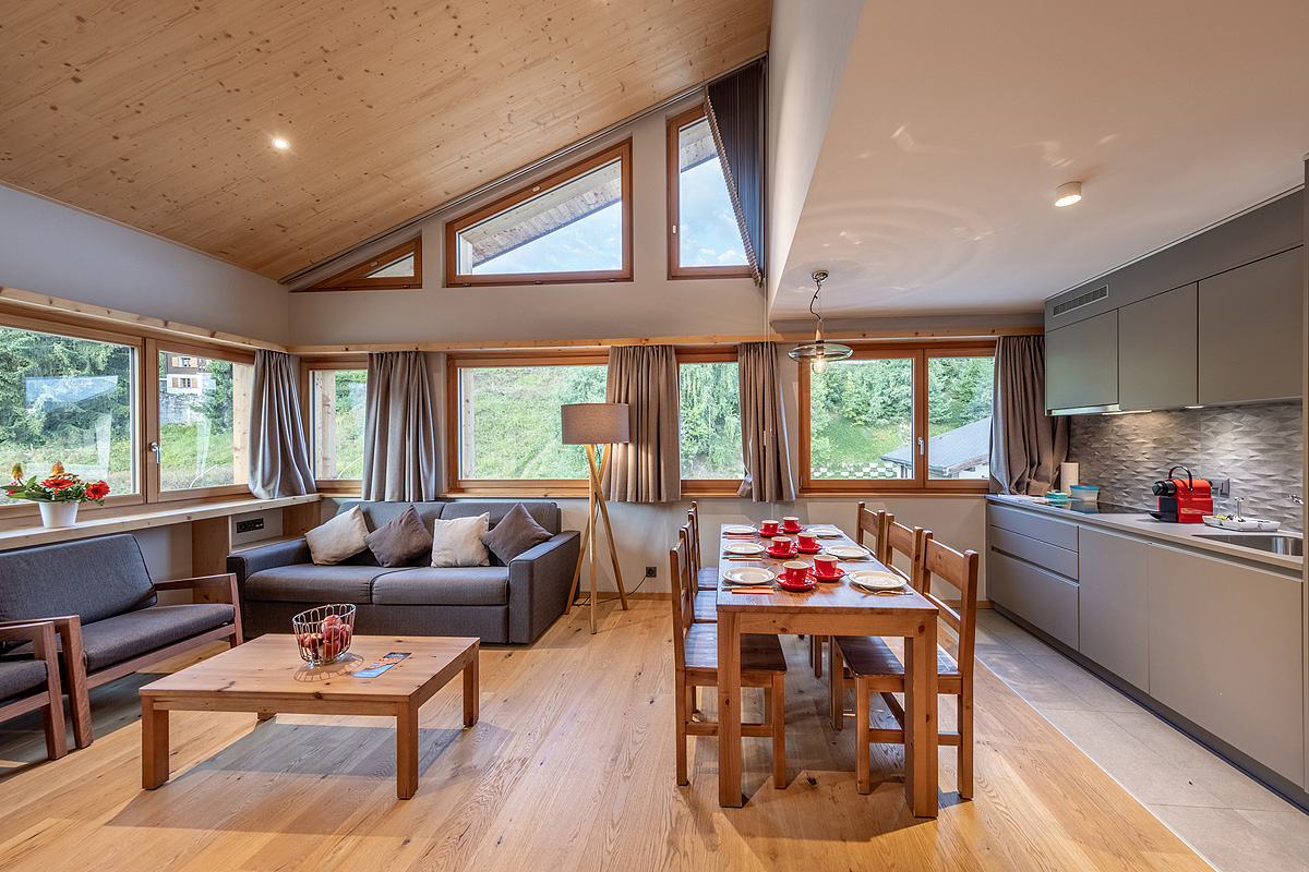72 m² - 1 ložnice s manželskou postelí či 2 samostatnými lůžky, 1 ložnice s postelí o šířce 160 cm, obývací pokoj s kuchyňským koutem a 2 rozkládacími gauči o šířce 160 cm pro 4 osoby, 2x sociální zařízení; apartmán má 2 patra