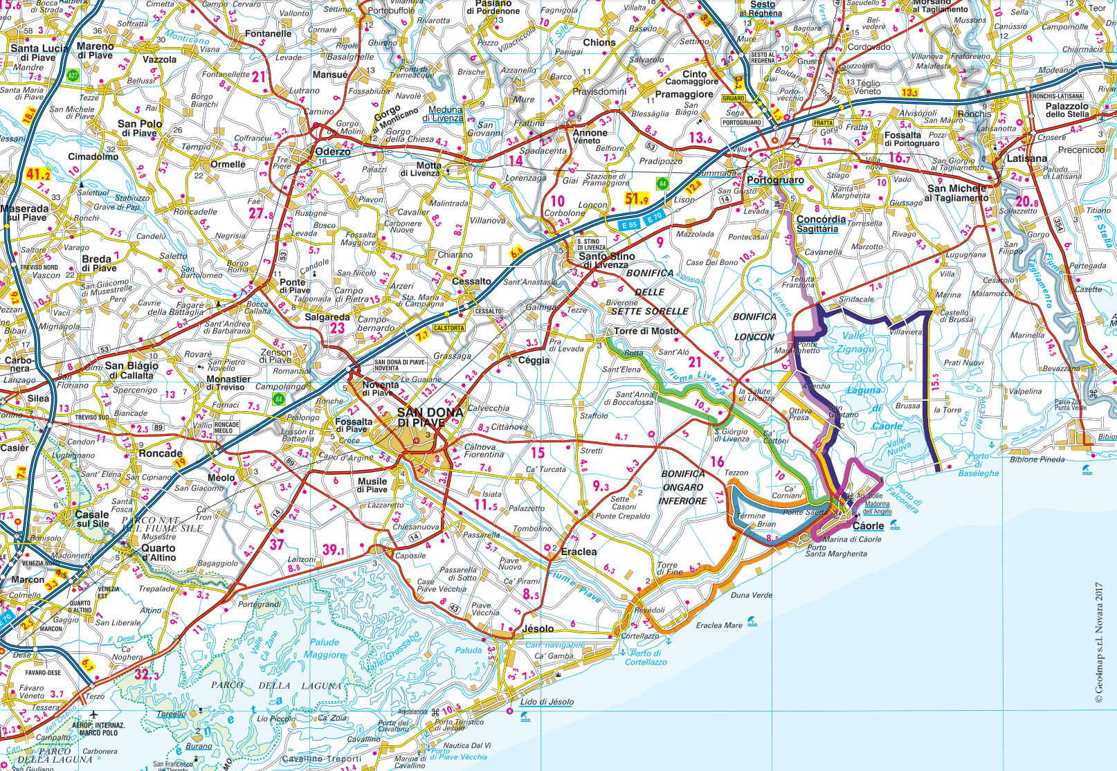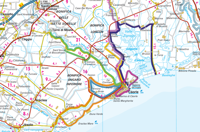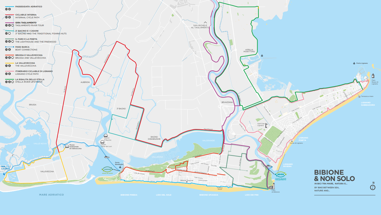 Těm, kteří chtějí vyrazit na kole pryč z města, se budou líbit trasy vedoucí na venkov k různým blízkým vesničkám nebo místním farmám s možností ochutnávky tradičních produktů. Zdatným cyklistům doporučujeme cyklistickou stezku z Bibione podél řeky Tagliamento.